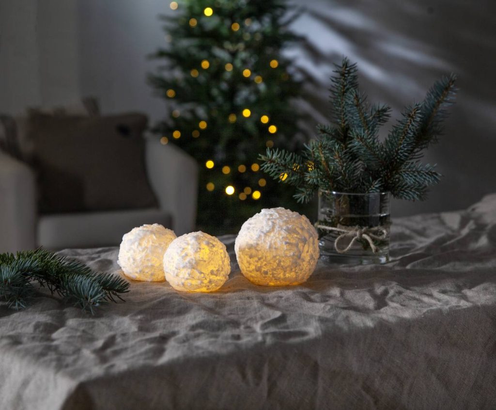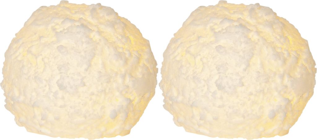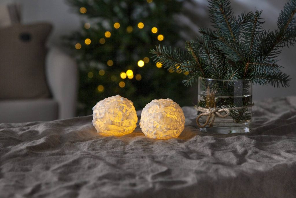 Lumipallon muotoinen vahakynttilä lämpimän valkoisella valolla. Sisäkäyttöön. Pakkaus sisältää kaksi kynttilää.
