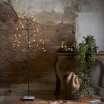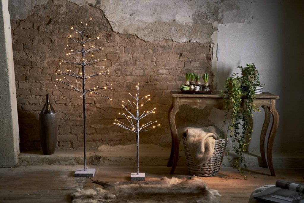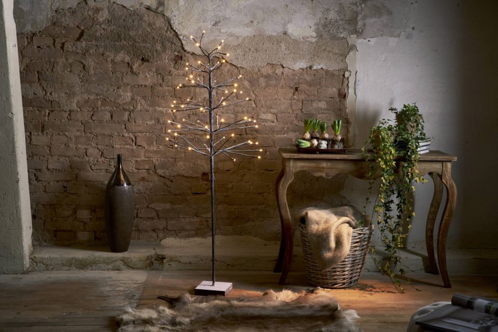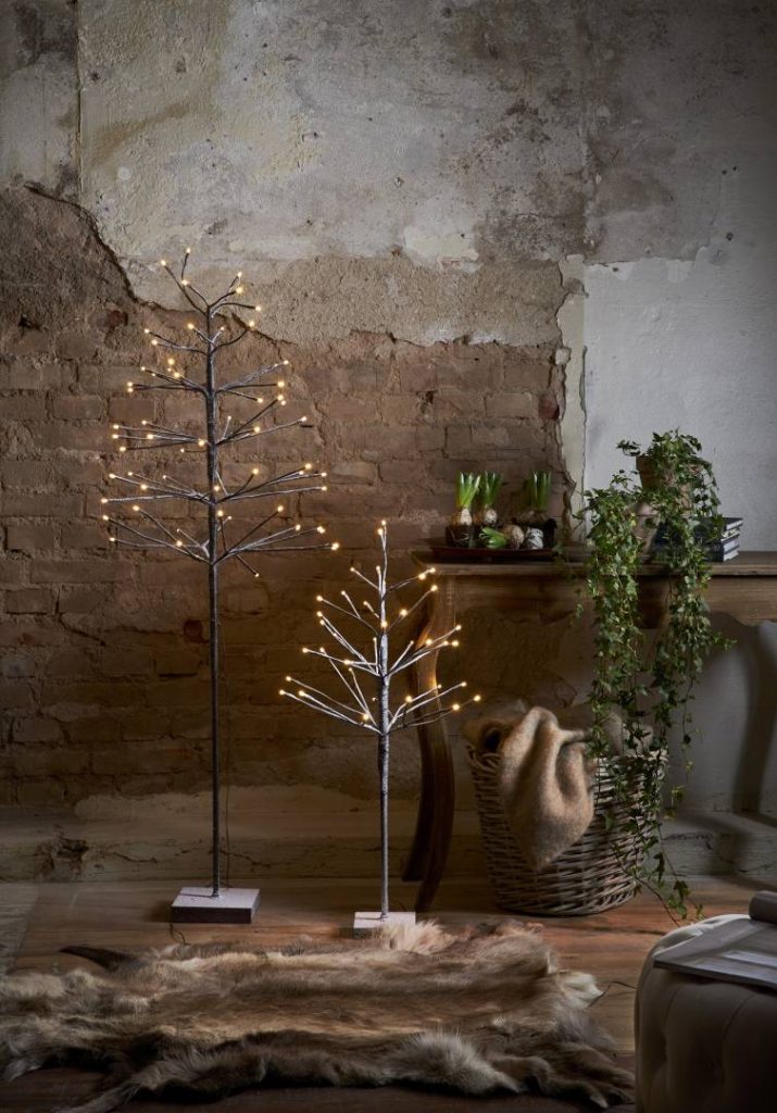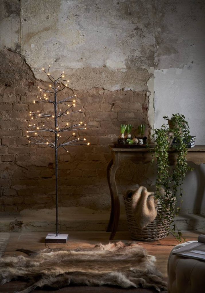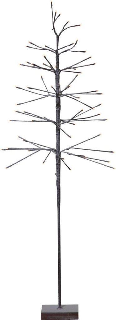 Sisäkäyttöön sopiva koristepuu, jossa on ruskea runko ja lumikoristellut oksat. Koristetta valaisee 63 lämpimän valkoista LED-valoa.