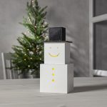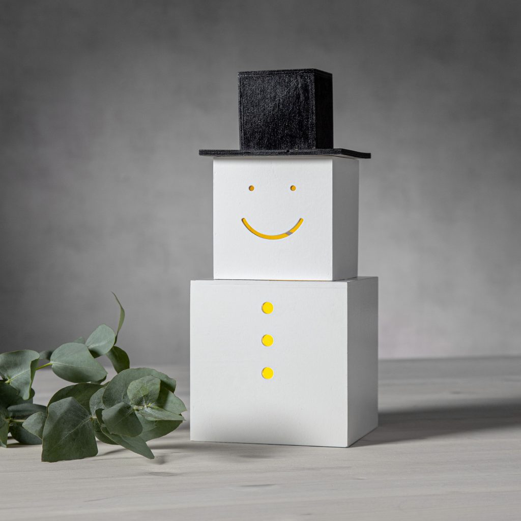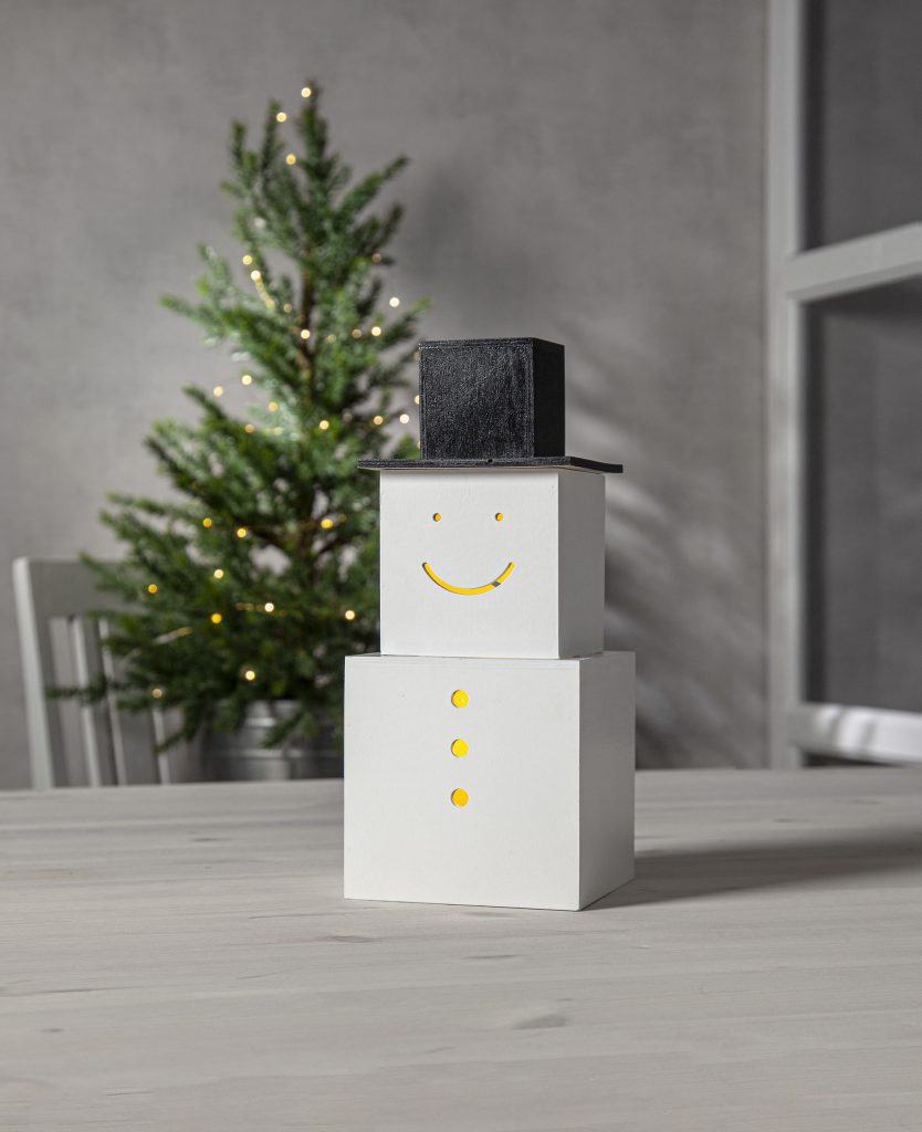 Puusta valmistettu lumiukko-koristehahmo loistaa lämpimän valkoista valoa sen sisälle ripustettavan valosarjan avulla. Lumiukko kohtaa valoa kahteen suuntaan ja luo talvista tunnelmaa. Paristokäyttöinen lumiukko sopii esimerkiksi ikkunalaudalle tai lipastolle sijoitettavaksi.