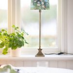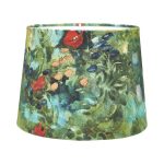 Lampunvarjostin puuvillaa. Kuosi on Carl Larssonin maalauksesta ”Blomster”. Vaalea sisäpinta, kankaan reunat käännetty.
