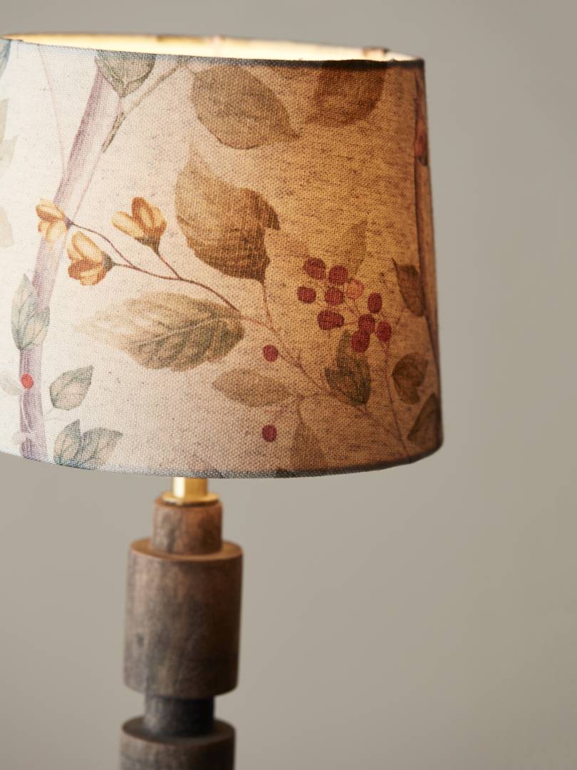 Lampunvarjostin kuvioitua kangasta.