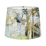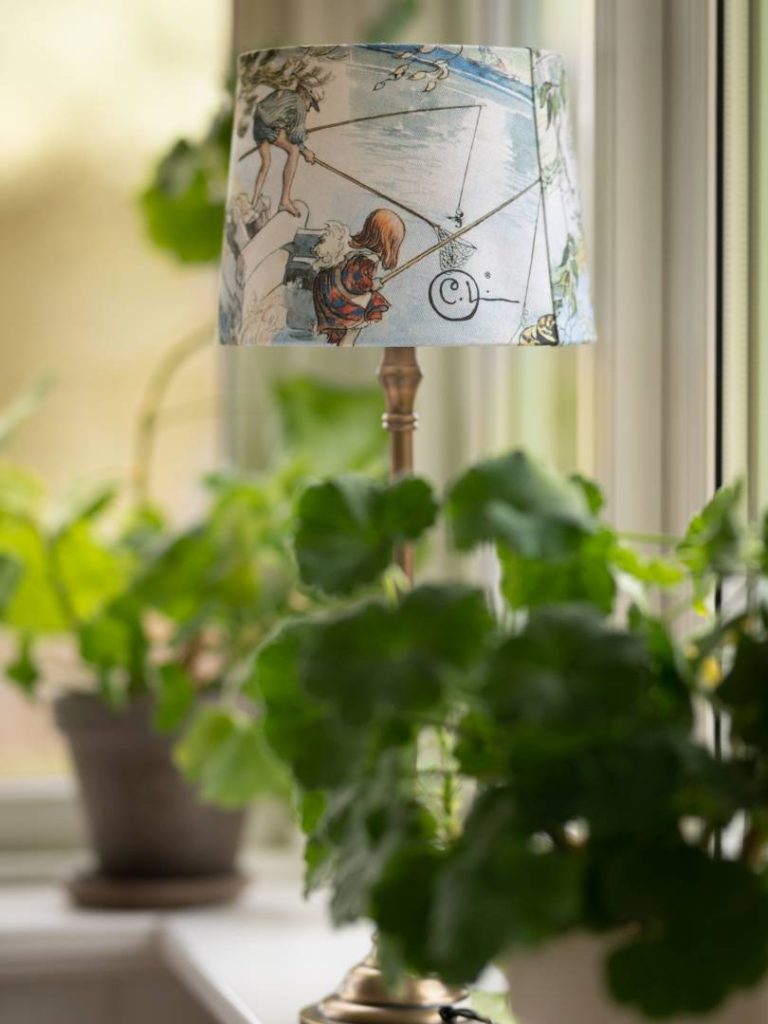 Lampunvarjostin puuvillaa. Kuosi on Carl Larssonin maalauksesta ”Kräftfångst”. Vaalea sisäpinta, kankaan reunat käännetty.