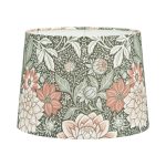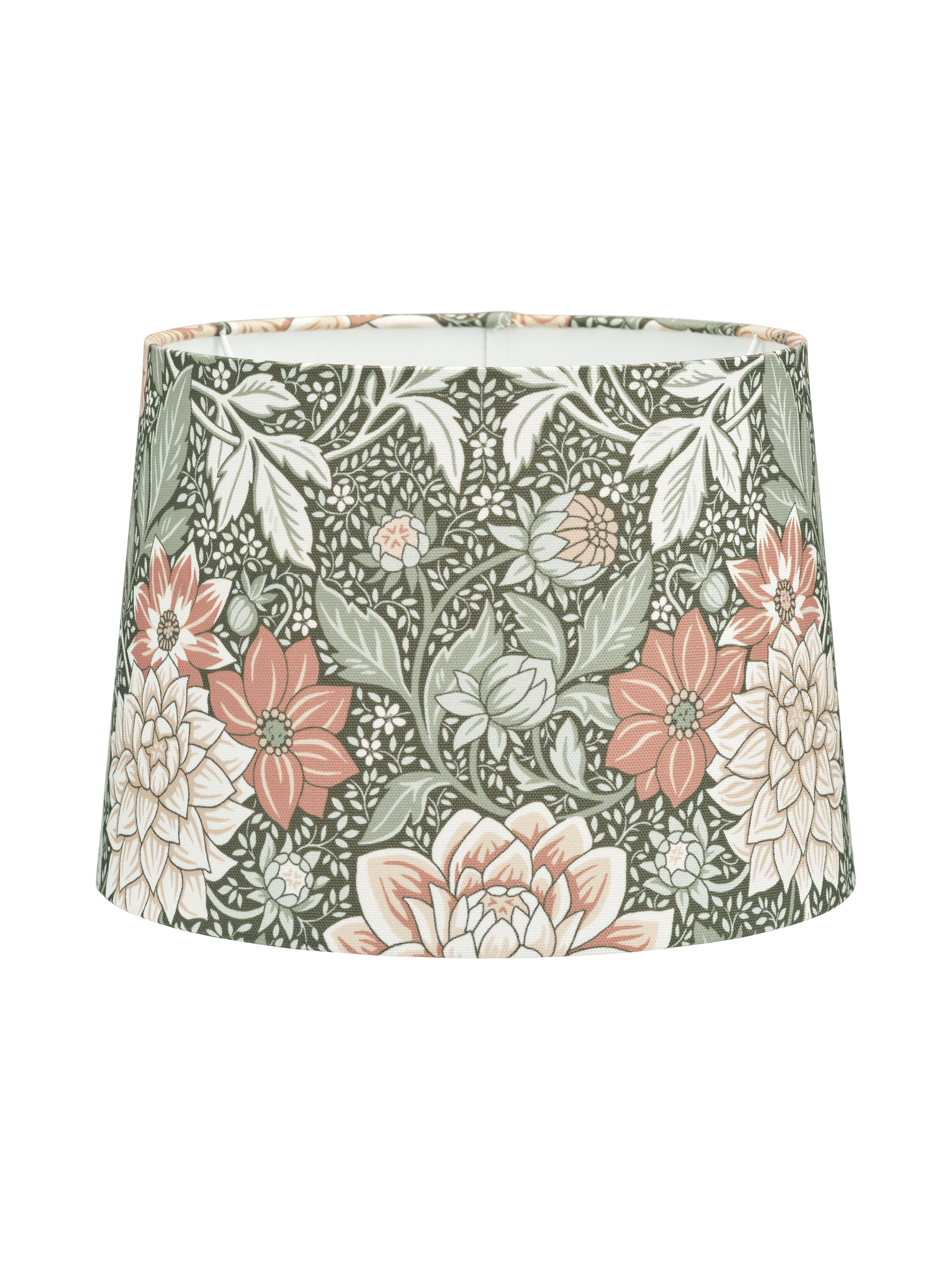 Dahlia-lampunvarjostin vihreän ja vaalean roosan värisenä. Varjostin on luotu PR Homen ja Boråstapeterin yhteistyönä. Dahlia Garden -kangas on 100% kierrätettyä polyesteria, kuvio on digitaalisesti painettu, ja värit tulevat kuosista kauniisti esiin. Kangas on painettu Boråsissa, Ruotsissa. Kuvion on käsin maalannut suunnittelija Jenny Hahne Gadd Boråstapeterille.