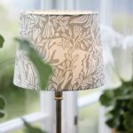 Under the Elder Tree -lampunvarjostin rauhallisen harmaanvihertävän värisenä. Varjostin on luotu PR Homen ja Boråstapeterin yhteistyönä. Under the Elder Tree -kangas on 100% kierrätettyä polyesteria, kuvio on digitaalisesti painettu, ja värit tulevat kuosista kauniisti esiin. Kangas on painettu Boråsissa, Ruotsissa.