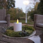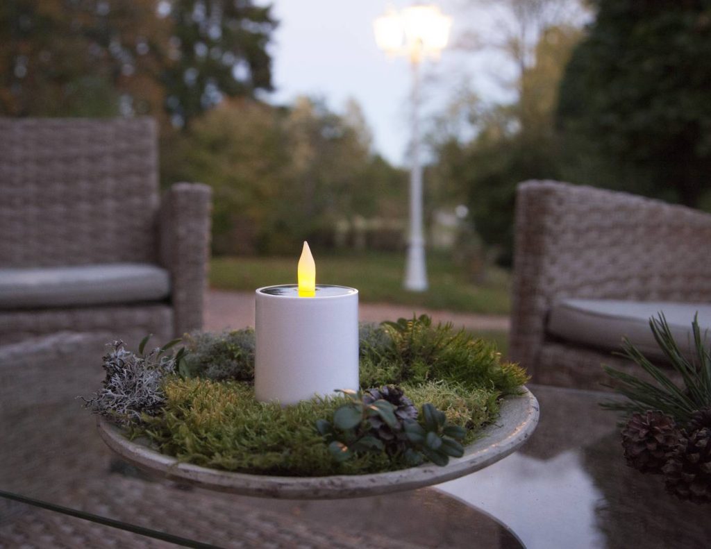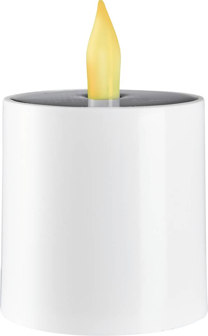 Aurinkokennolla toimiva LED-kynttilä, jossa on keltainen valo. Sopii esimerkiksi pihapöydälle kesäiltojen tunnelmavalaistukseen.