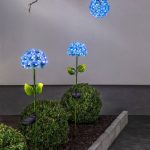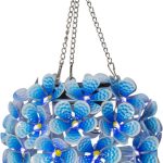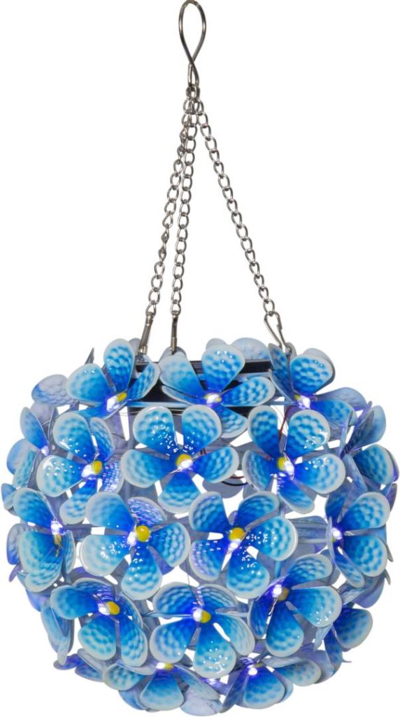 Aurinkokennolla toimiva kaunis ripustettava koriste, jossa on sininen Hortensia-kukka. Koristevalaisin valaisee hämärään aikaan kylmän valkoisilla Dew Drop -valoilla.