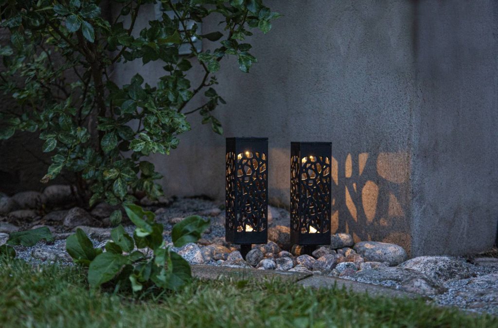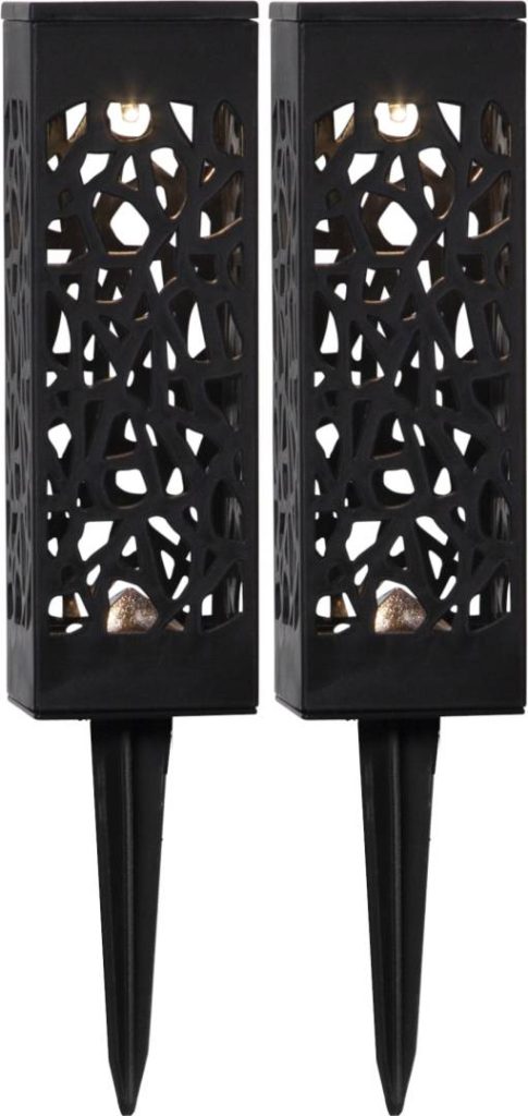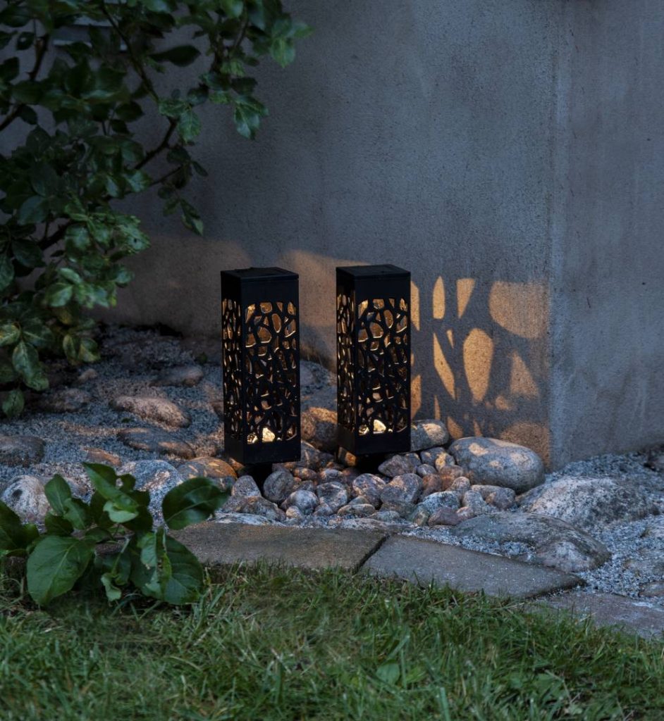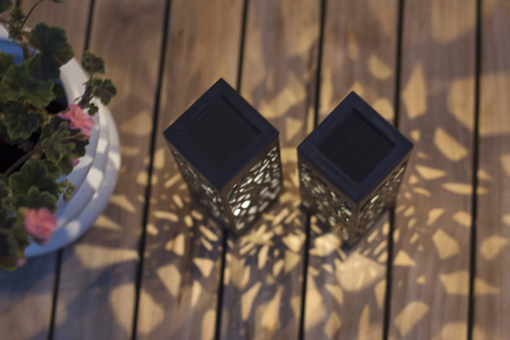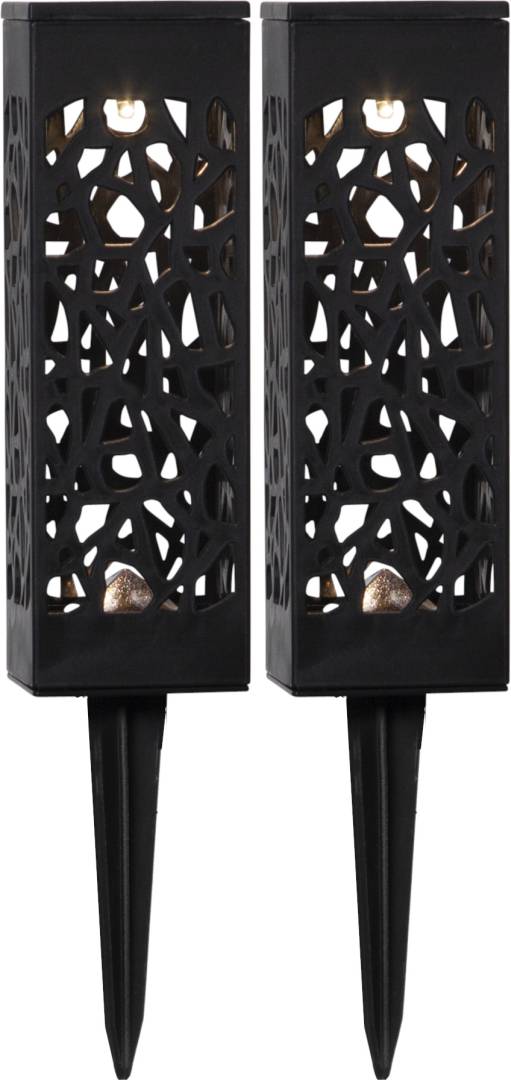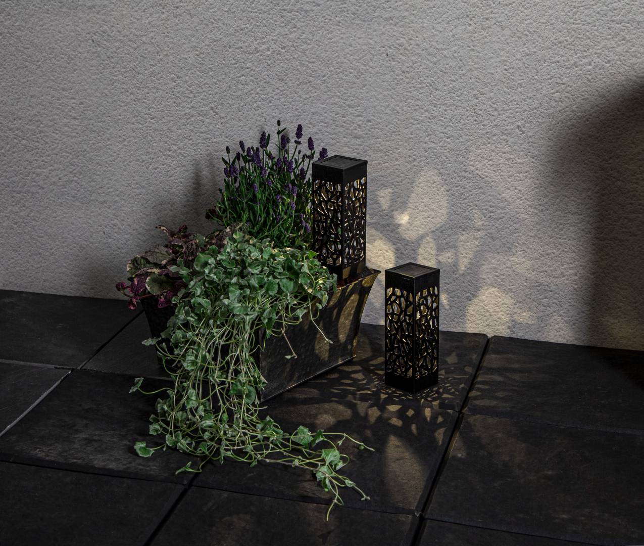 Aurinkokennolla toimiva koristevalaisin kahden kappaleen pakkauksessa. Valaisimiin syttyy hämärällä valkoinen valo ja ne heijastavat maahan koristeellisen valokuvion. Helppo sijoittaa esimerkiksi kukkaruukkuun tai istutusten lomaan maapiikkien avulla.