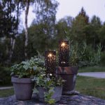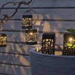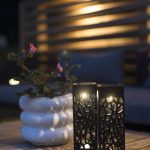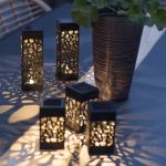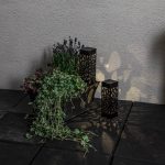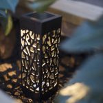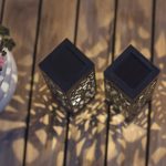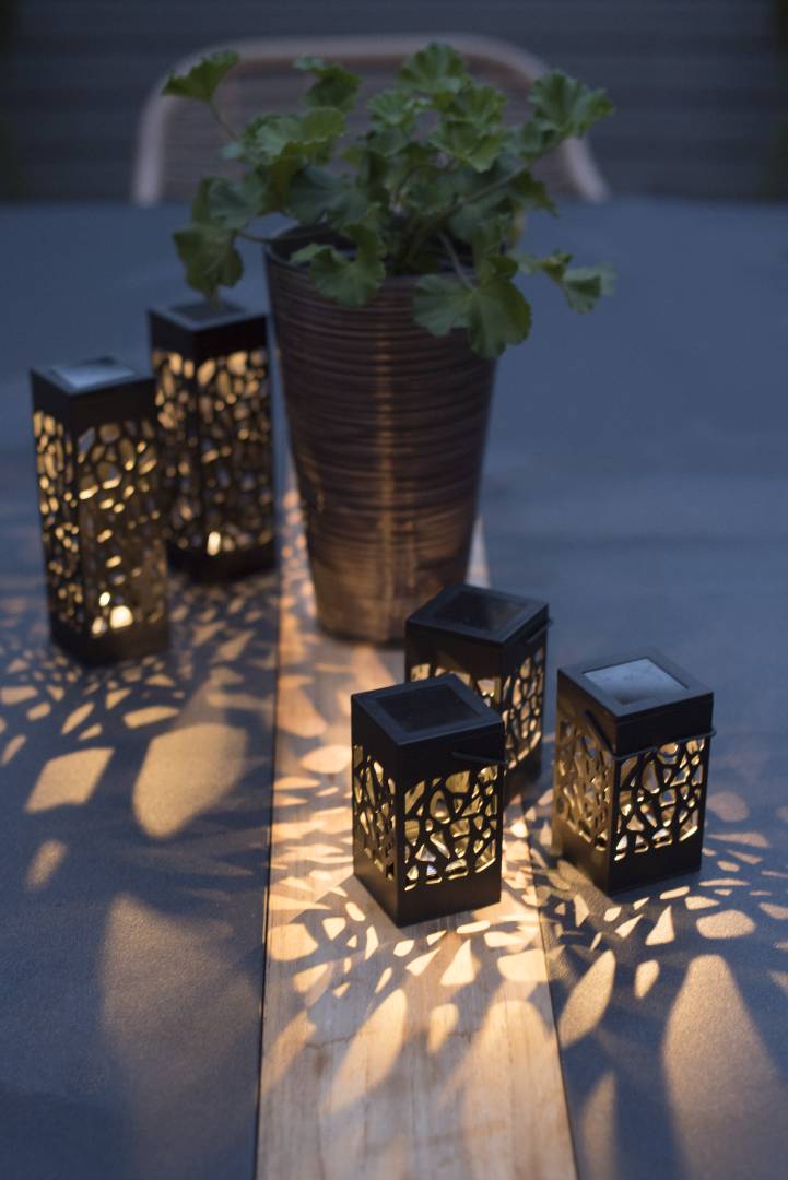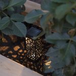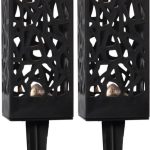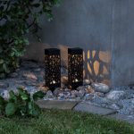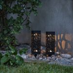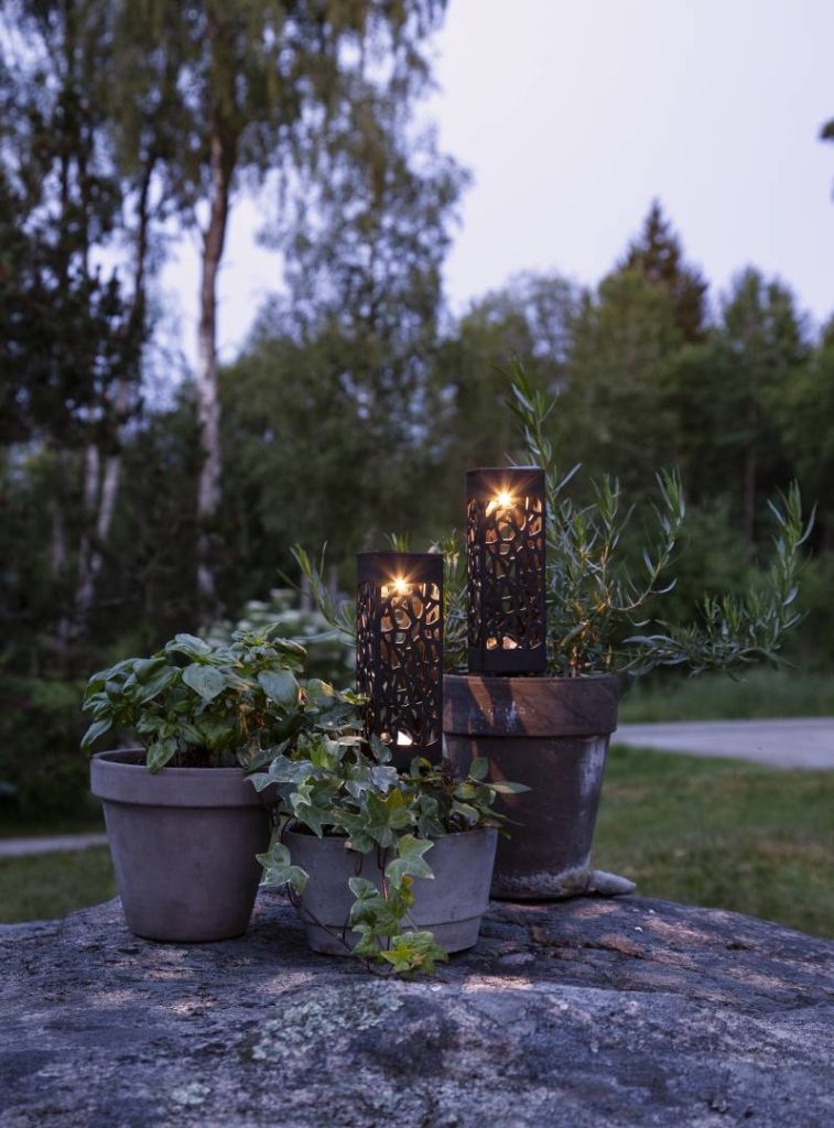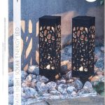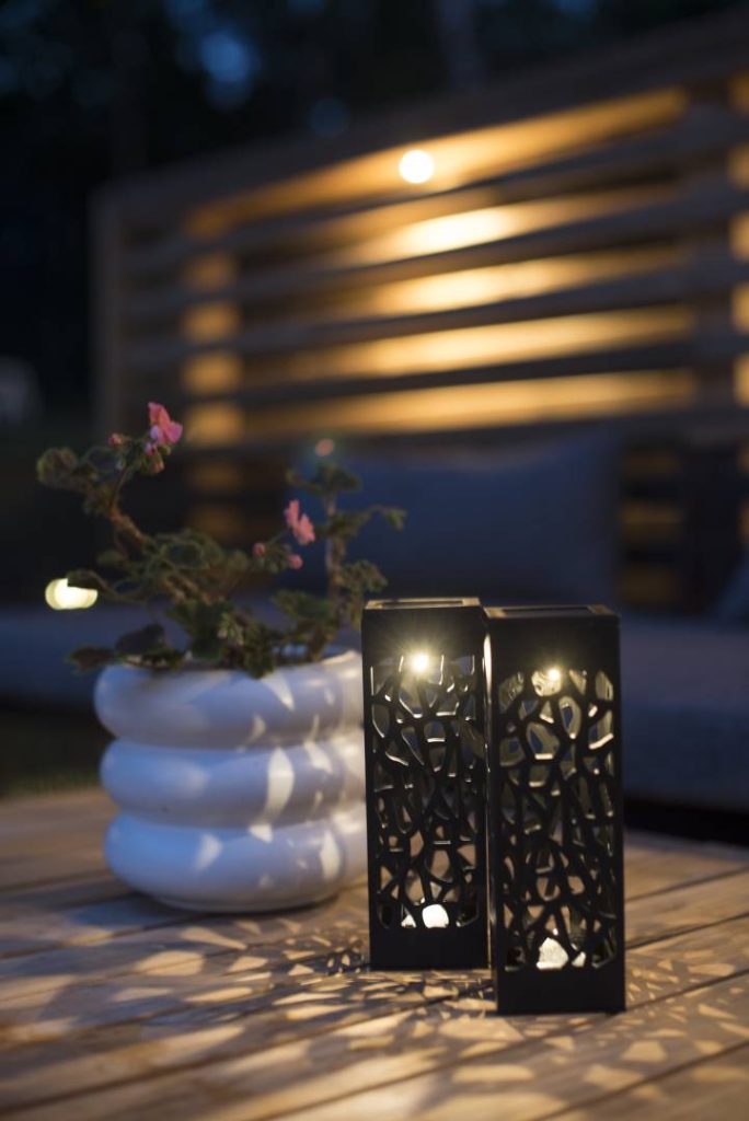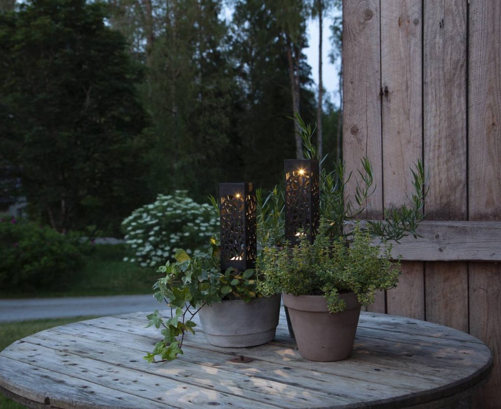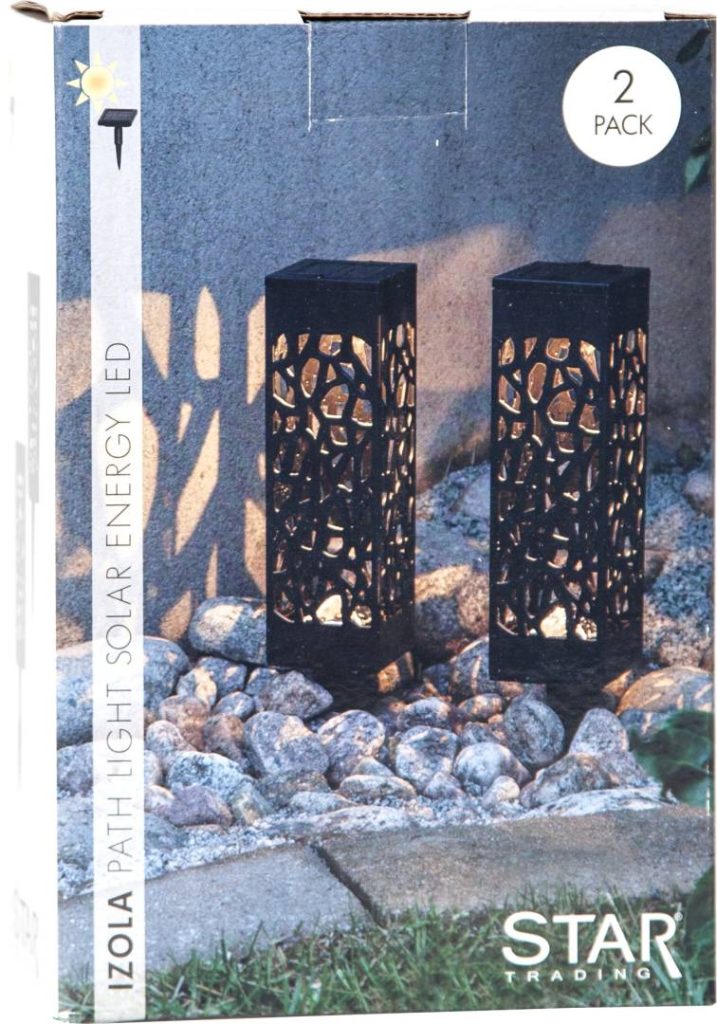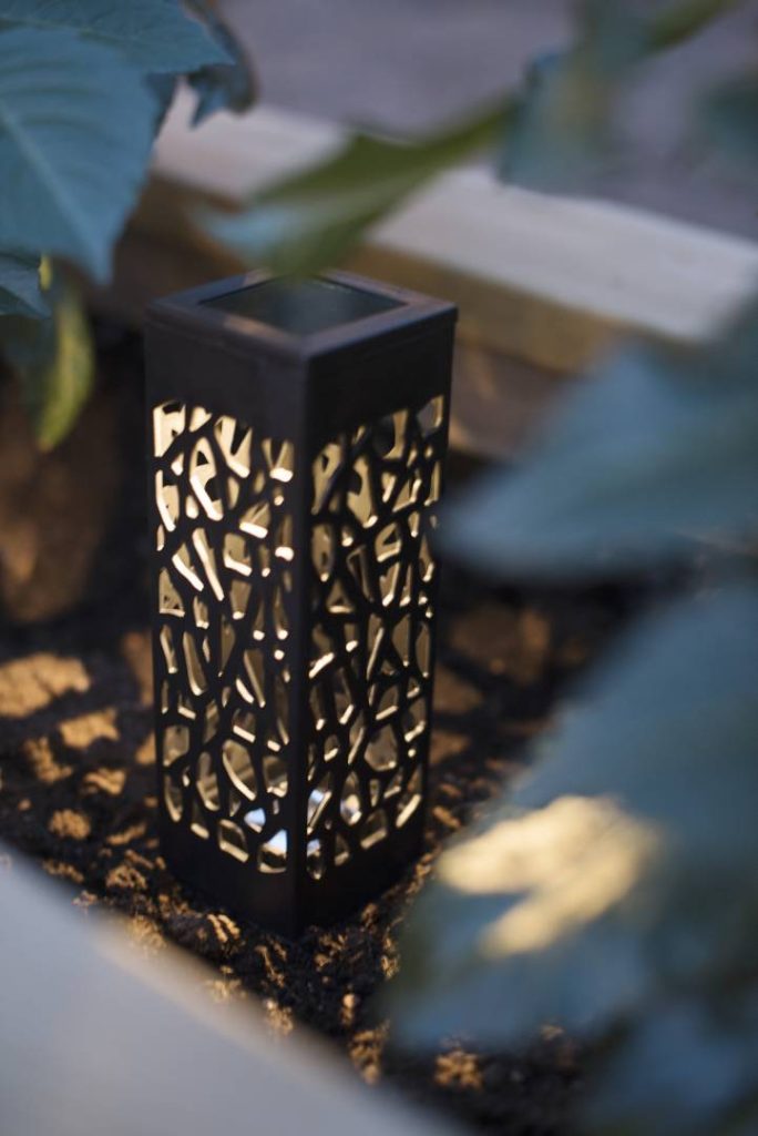 Aurinkokennolla toimiva koristevalaisin kahden kappaleen pakkauksessa. Valaisimiin syttyy hämärällä valkoinen valo ja ne heijastavat maahan koristeellisen valokuvion. Helppo sijoittaa esimerkiksi kukkaruukkuun tai istutusten lomaan maapiikkien avulla.