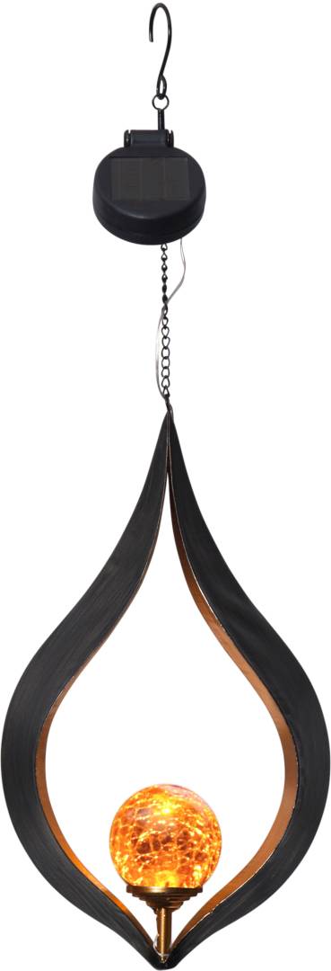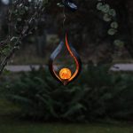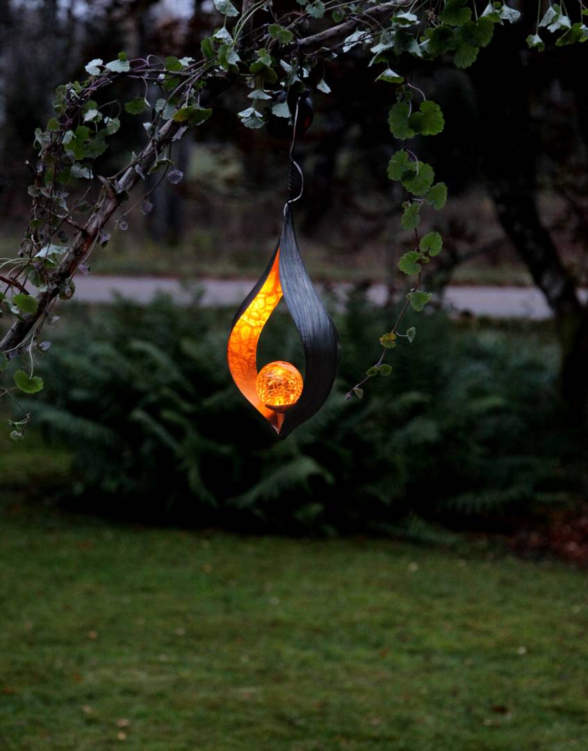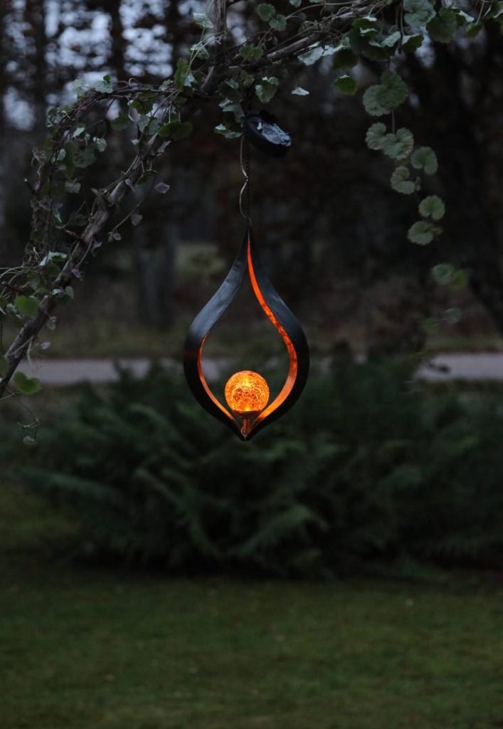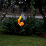 Aurinkokennolla toimiva liekin muotoinen koristevalaisin, joka valaisee hämärään aikaan meripihkan sävyisellä valolla.