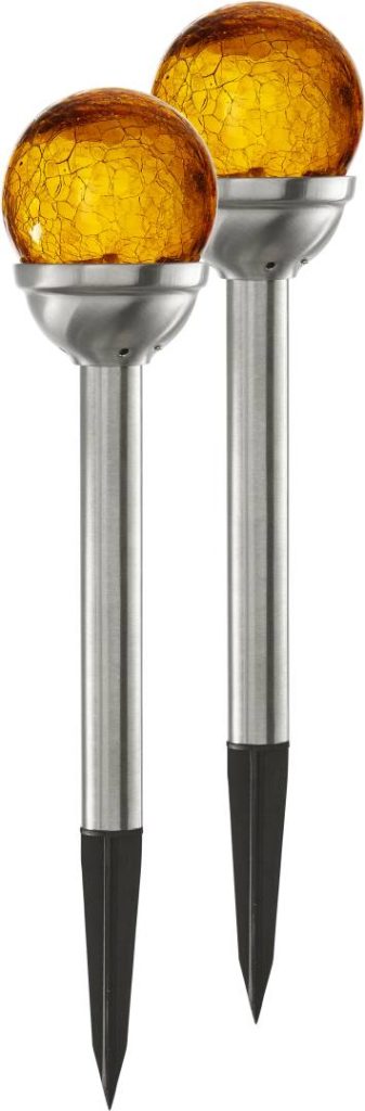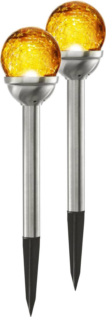 Aurinkokennolla toimiva 26,5 cm korkea pollari, jossa on krakleeratun meripihkan värisen lasipallon sisällä meripihkan sävyinen LED-valo. Sopii esimerkiksi sisäänkäynnin läheisyyteen, kulkureittien varrelle tai puutarhaan. Pakkaus sisältää kaksi valaisinta.