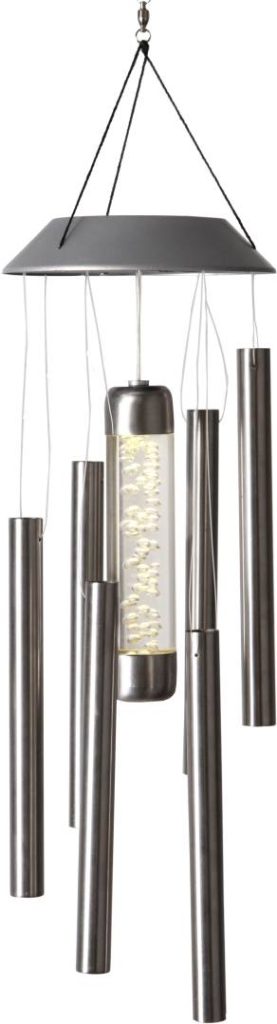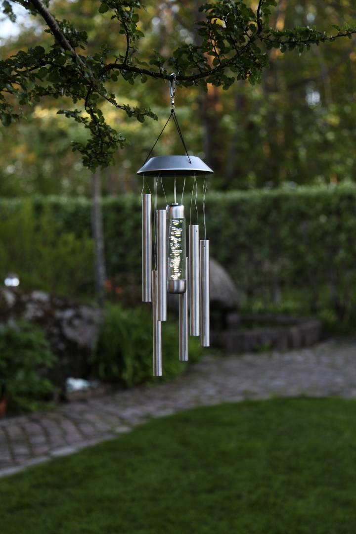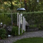 Aurinkokennolla toimiva tuulikello LED-valolla. Kaunis koriste puutarhaan. Tuulikellossa loistaa lämpimän valkoinen valo hämärään aikaan.