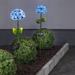 Aurinkokennolla toimiva kaunis koriste, jossa on sininen Hortensia-kukka. Koristevalaisin valaisee hämärään aikaan kylmän valkoisilla Dew Drop -valoilla.