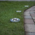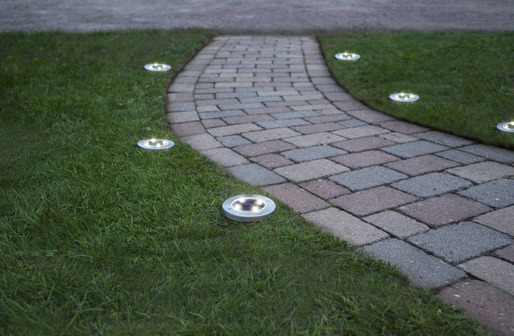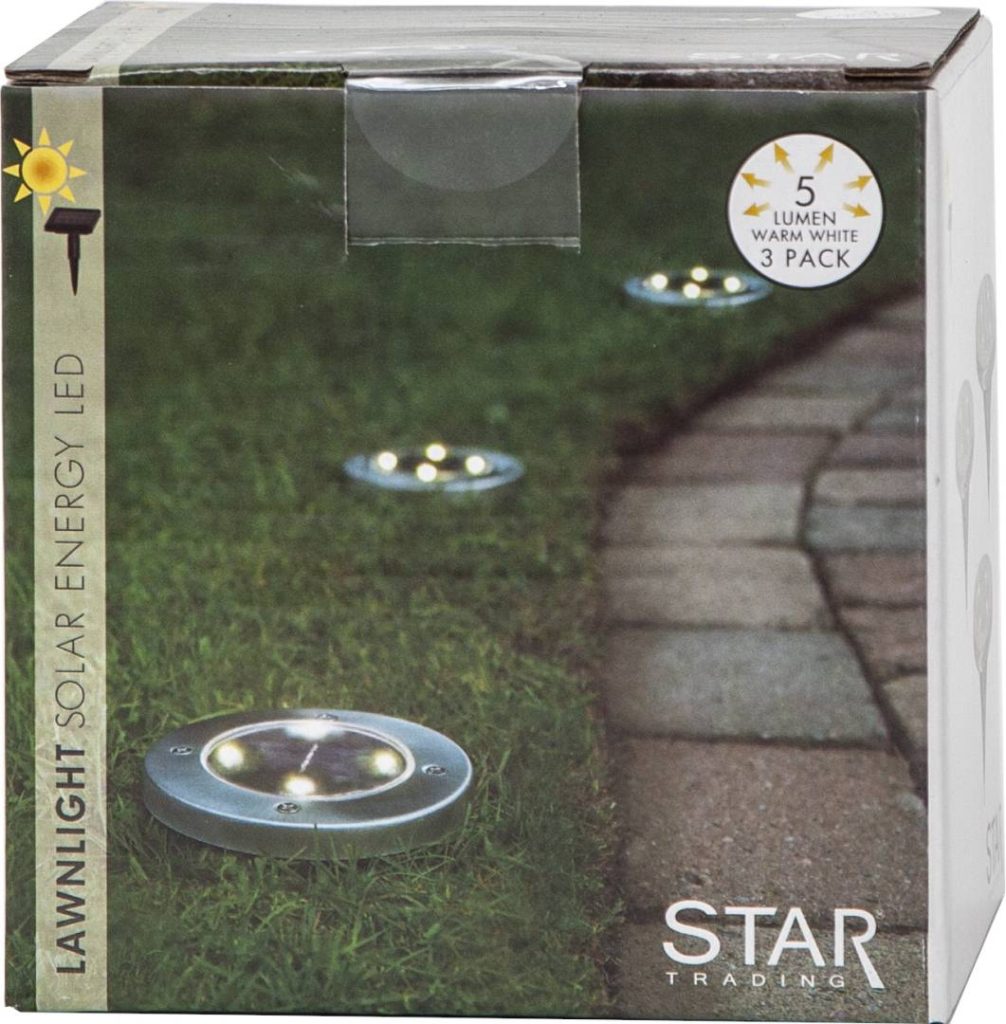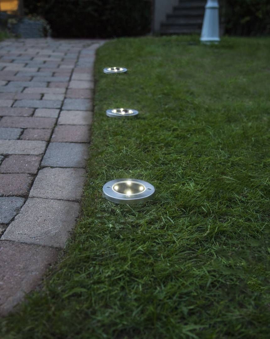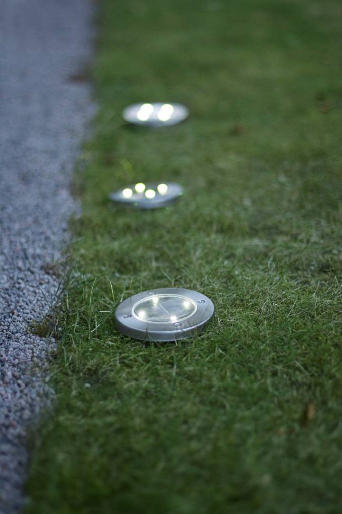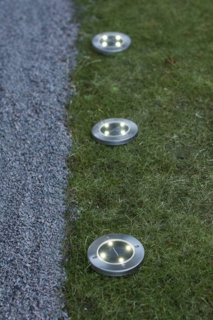 Aurinkokennolla toimiva valaisin kolmen kappaleen pakkauksessa. Valaisimissa on lämpimän valkoiset LED-valot, jotka valaisevat hämärällä 5 lumenin valoteholla. Valaisimet on helppo sijoittaa pehmeämmille kävelyteille ja nurmikolle maapiikkien avulla.