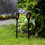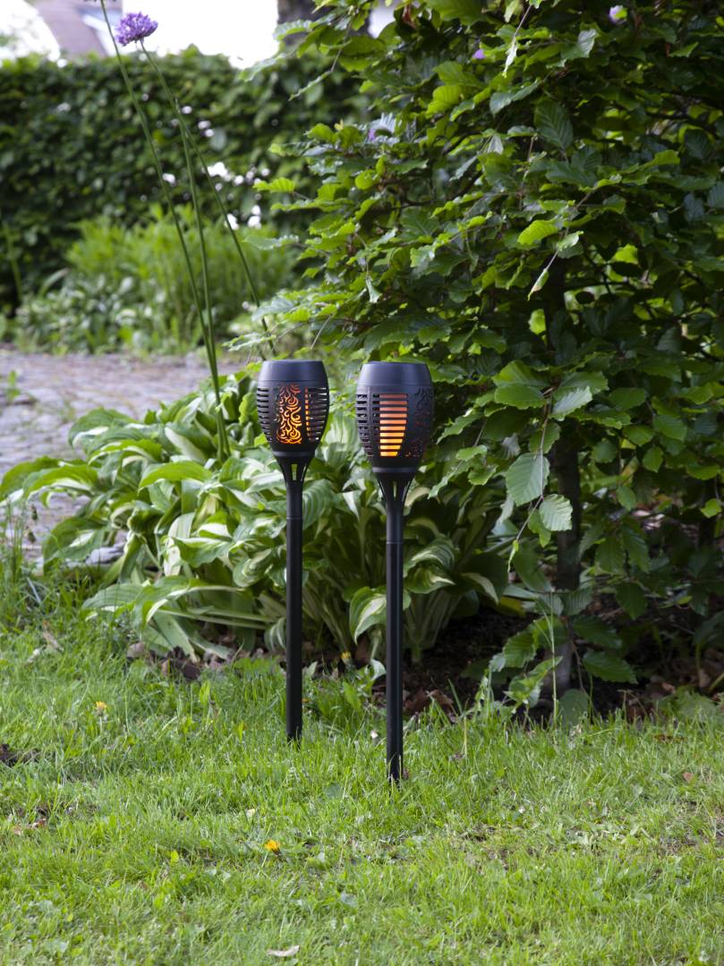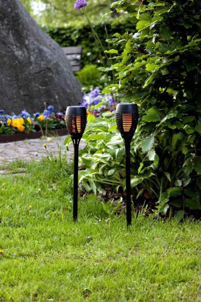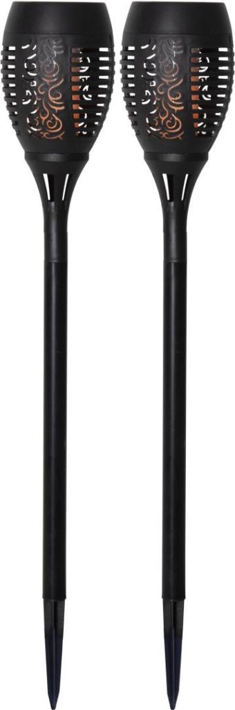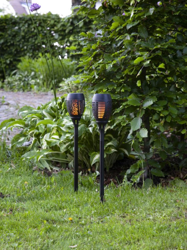 Aurinkokennolla toimiva musta soihtu, jossa on keltainen liekehtivä LED-valo. Kaunis koristevalaisin puutarhaan. Pakkaus sisältää kaksi valaisinta.