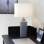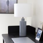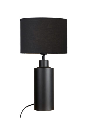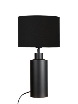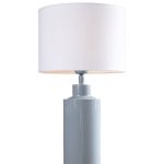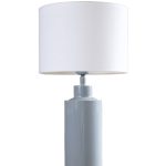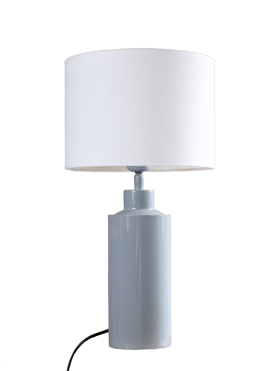 Pöytävalaisinpaketti, jossa on 32 cm korkea kiiltävän farkunsininen Solo-lampunjalka ja sylinterin muotoinen valkoinen puuvillavarjostin.