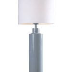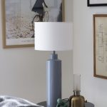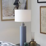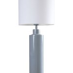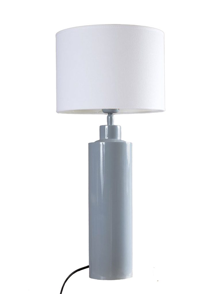 Pöytävalaisinpaketti, jossa on 44 cm korkea kiiltävän farkunsininen Solo-lampunjalka ja sylinterin muotoinen valkoinen puuvillavarjostin.