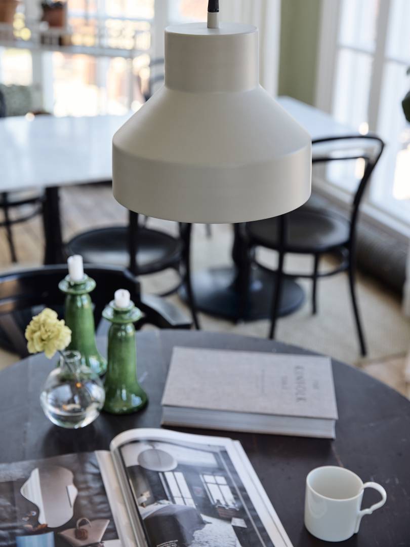 PR Homen Solo on pelkistetty metallista valmistettu riippuvalaisin, joka sopii esimerkiksi ruokapöydän tai keittiösaarekkeen yläpuolelle. Varjostin on mattabeige niin ulko- kuin sisäpinnalta.