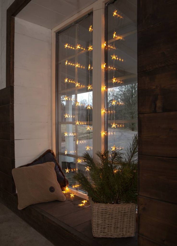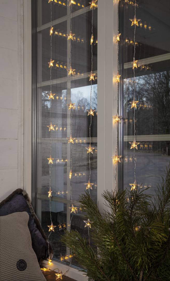 Sisäkäyttöön sopiva valoverho 50 läpinäkyvällä tähdellä, joissa loistaa lämpimän valkoinen valo. Kirkas kaapeli. Ripusta esimerkiksi ikkunaan tuomaan tunnelmavalaistusta.