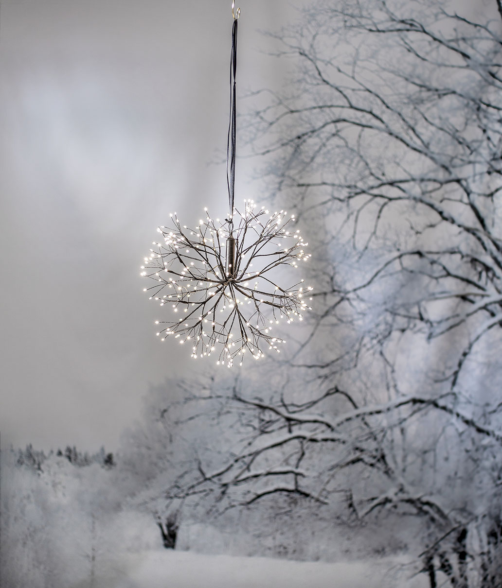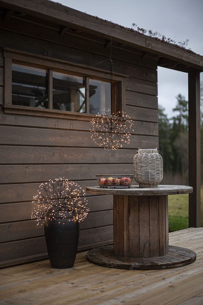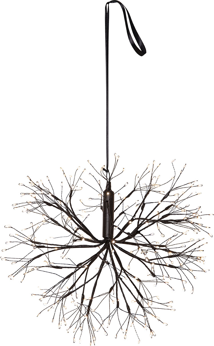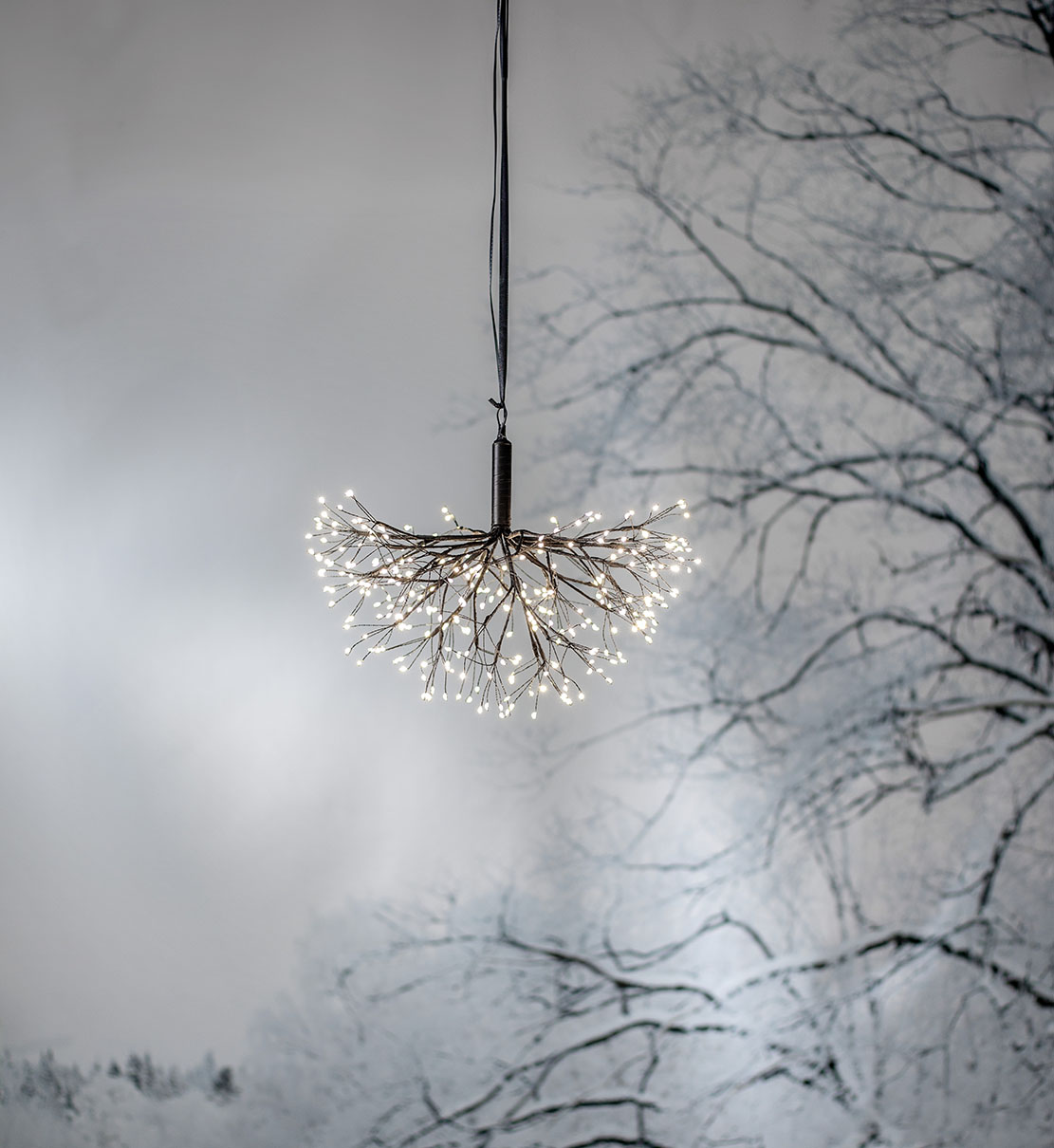 Ulko- ja sisäkäyttöön sopiva ripustettava koriste. Koristeessa on 16 muotoiltavaa oksaa, ja niissä 288 lämpimän valkoista LED-valopistettä.