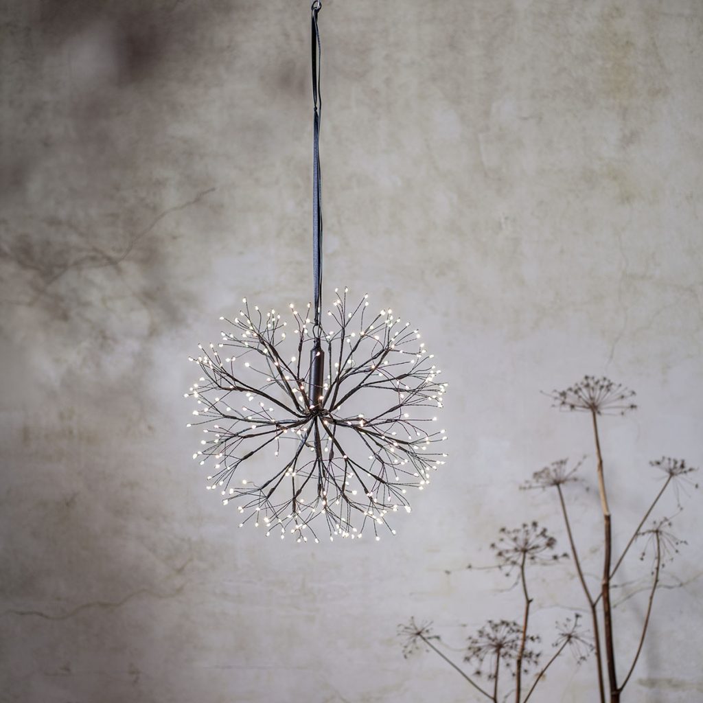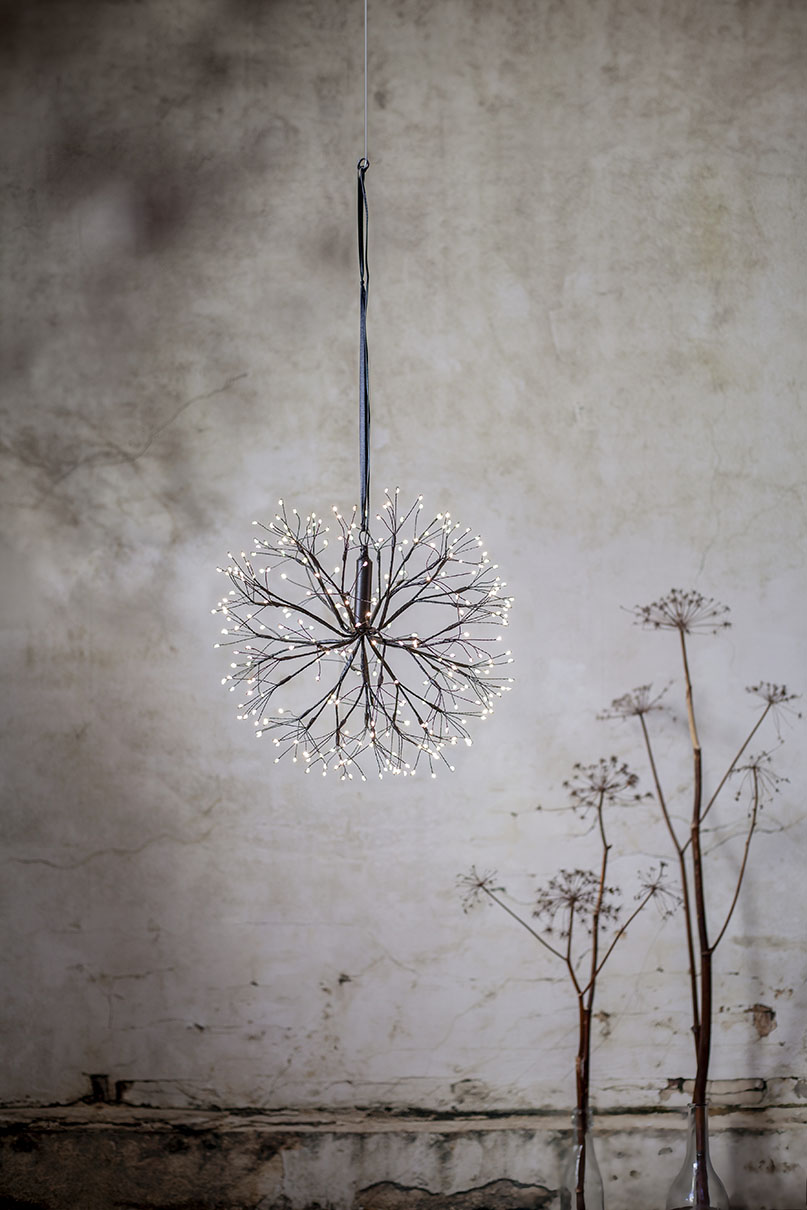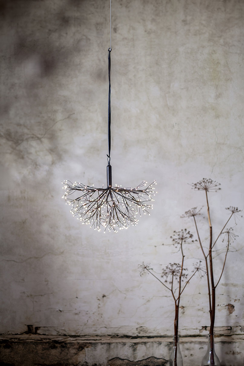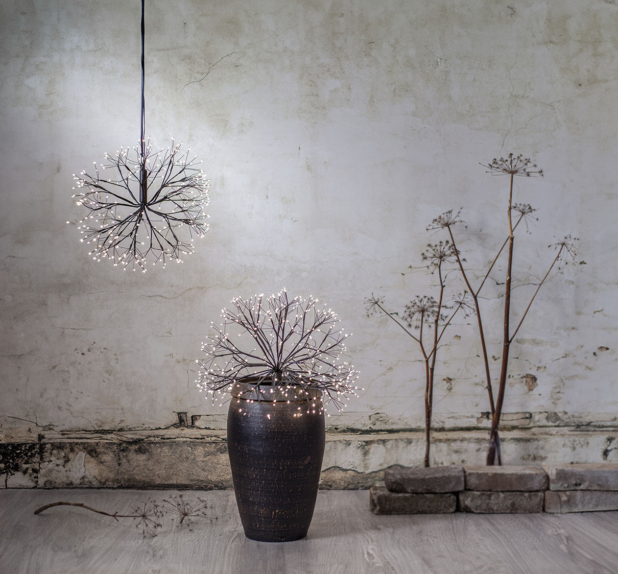 Ulko- ja sisäkäyttöön sopiva ripustettava koriste. Koristeessa on 16 muotoiltavaa oksaa, ja niissä 288 lämpimän valkoista LED-valopistettä.
