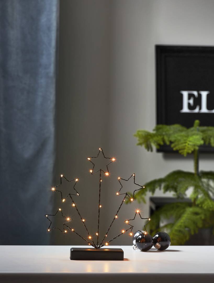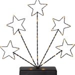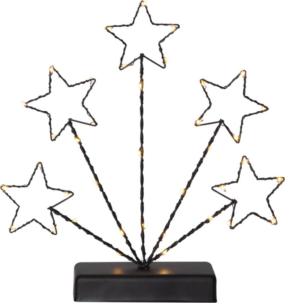 Musta metallista valmistettu pöytäkoriste, jossa on viisi tähteä. Koristetta valaisevat lämpimän valkoiset LED-valot. Kaunis koriste, joka tuo tunnelmallista ja kodikasta valoa.