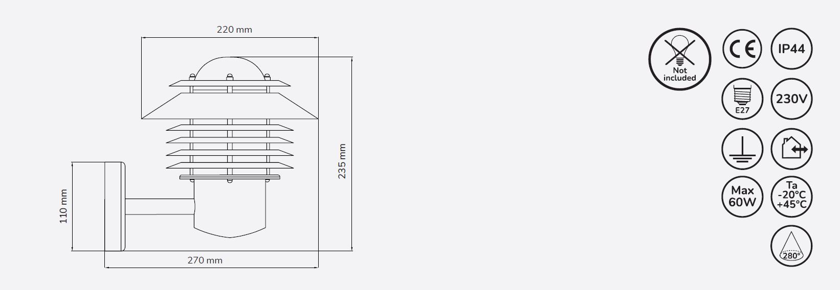 IP44. E27, max 60W. Ei sisällä valonlähdettä.
