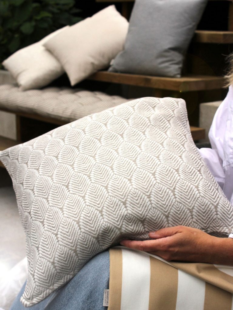 Ulkokäyttöön tarkoitettu tyynynpäällinen valon- ja säänkestävää kangasta.