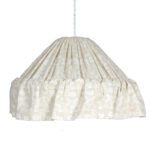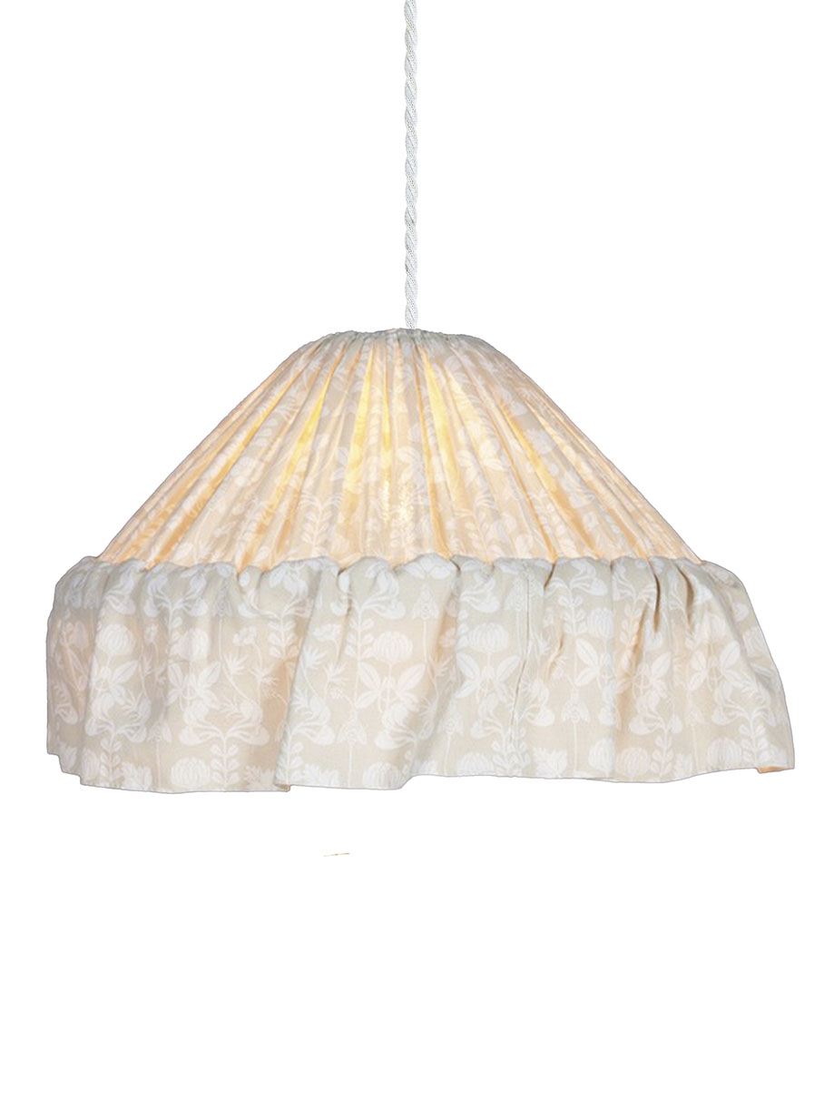 Stina-riippuvalaisimen kartiomainen varjostin on verhoiltu rypytetyllä kankaalla, ja sen alareunaa koristaa 15 cm korkea röyhelö. Kankaan kuvio ’De Mina’ esiintyy joidenkin Carl Larssonin kirjojen alkulehdillä, muun muassa kirjassa ’De mina’.