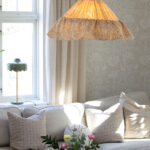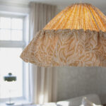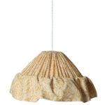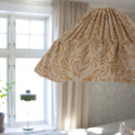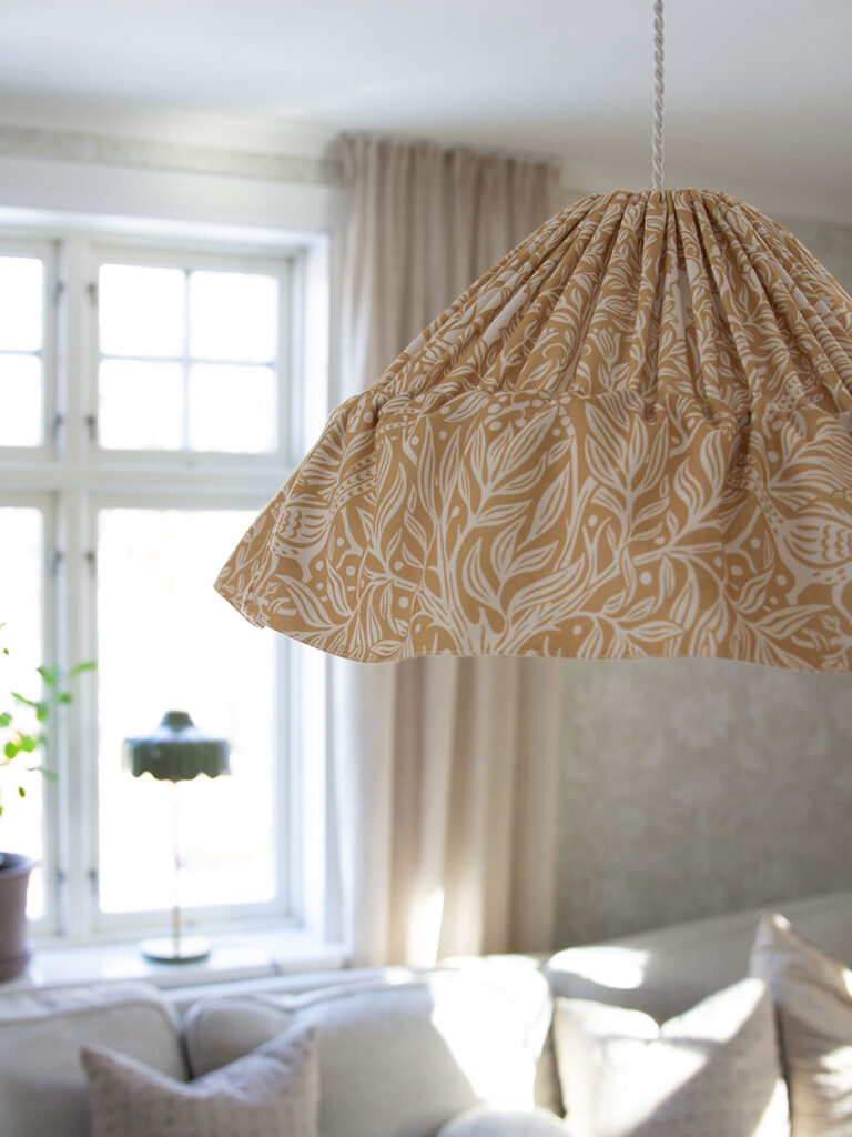 Stina-riippuvalaisimen kartiomainen varjostin on verhoiltu rypytetyllä kankaalla, ja sen alareunaa koristaa 15 cm korkea röyhelö. Under the Elder Tree -kangas on 100% kierrätettyä polyesteria, kuvio on digitaalisesti painettu, ja värit tulevat kuosista kauniisti esiin. Kangas on painettu Boråsissa, Ruotsissa. Kankaan tiheä lehvästö luo kauniin yhtenäisen kuvion ja lähempää tarkasteltuna metsän valtakunnasta paljastuu kauniita yksityiskohtia.