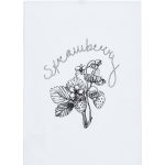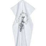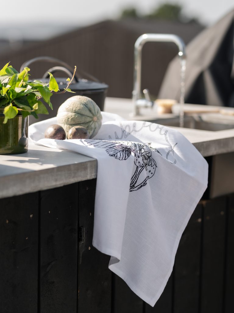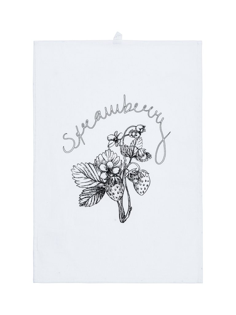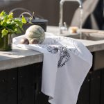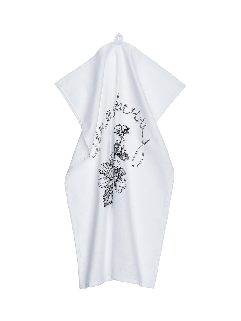 Puuvillainen keittiöpyyhe, jossa on painettu kuviointi. Ripustuslenkki pyyhkeen kulmassa.