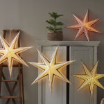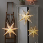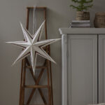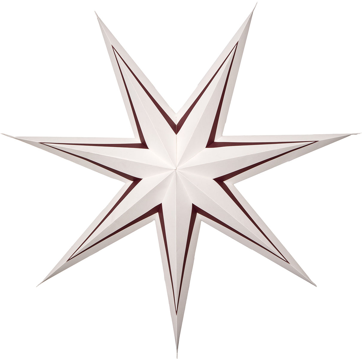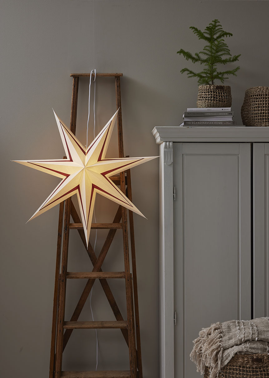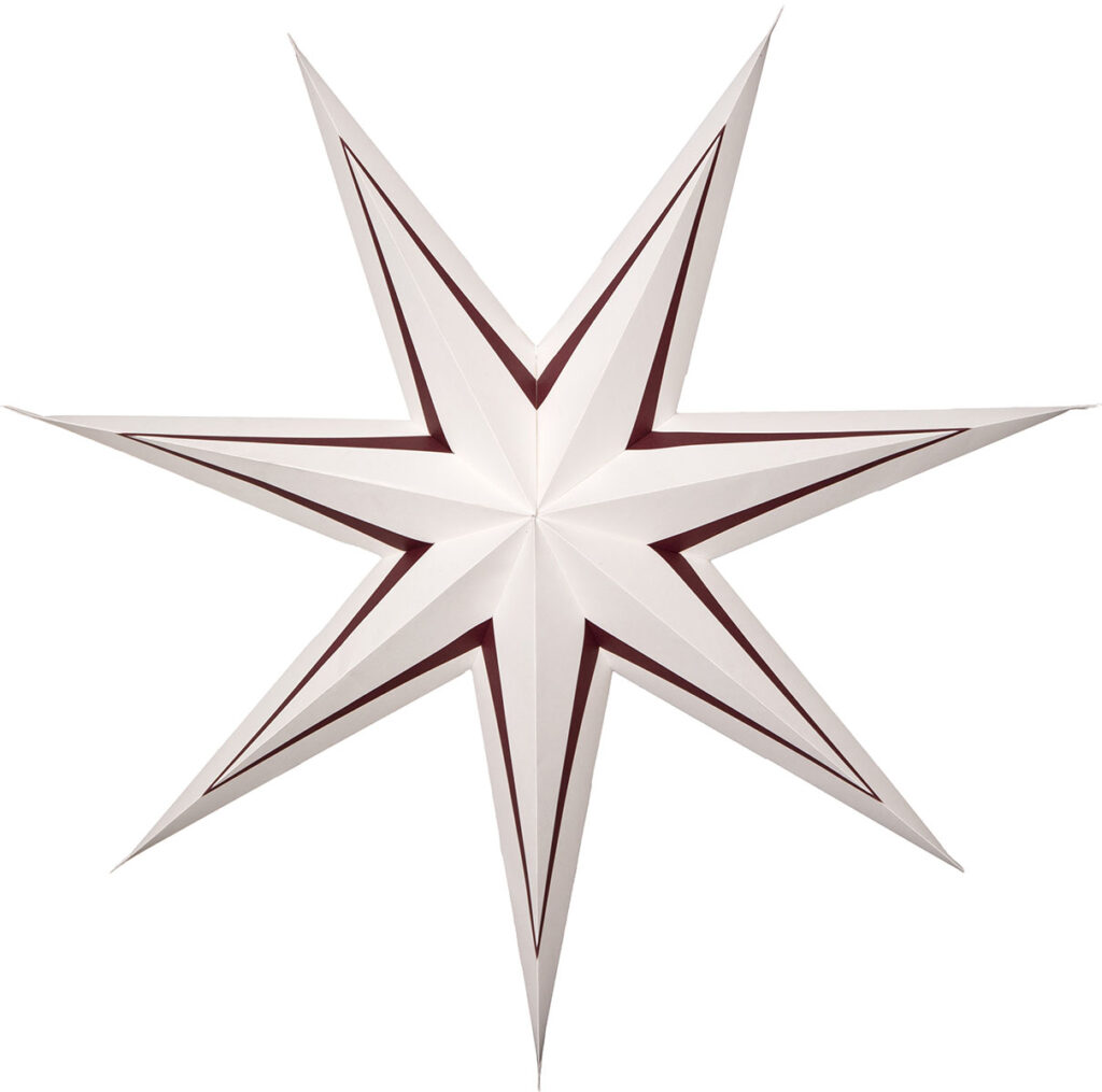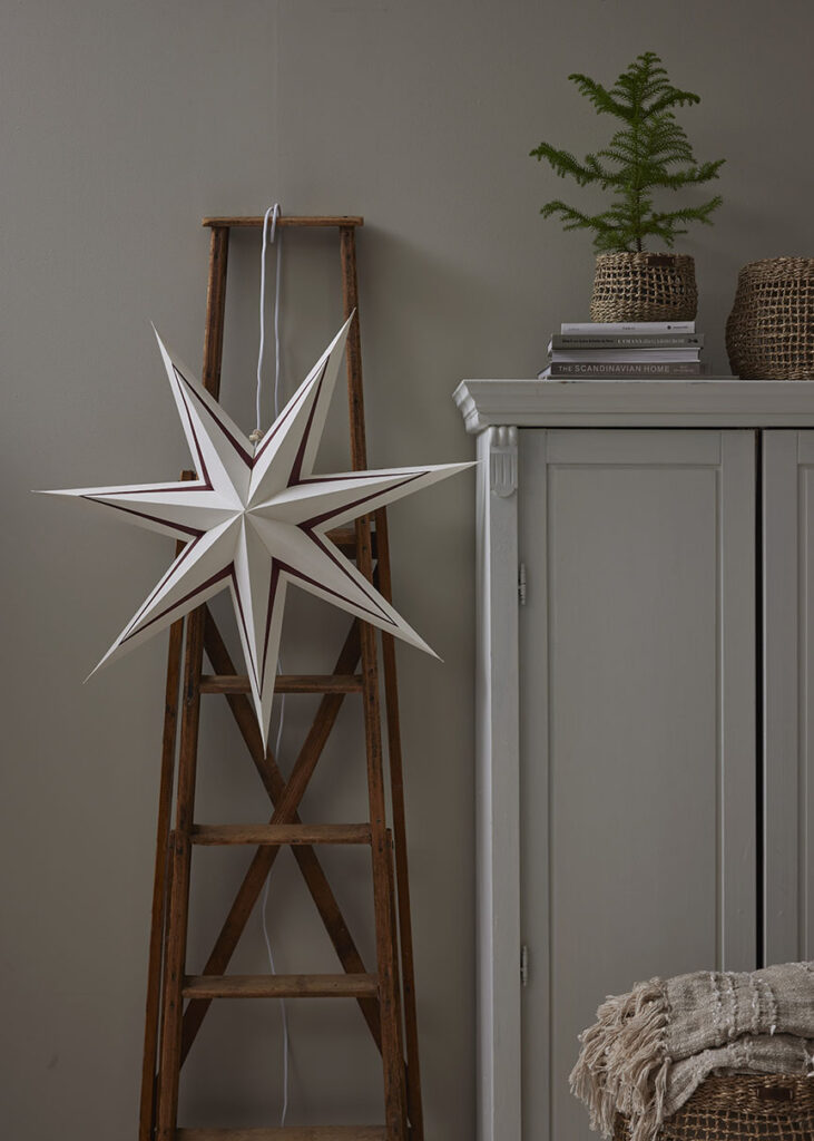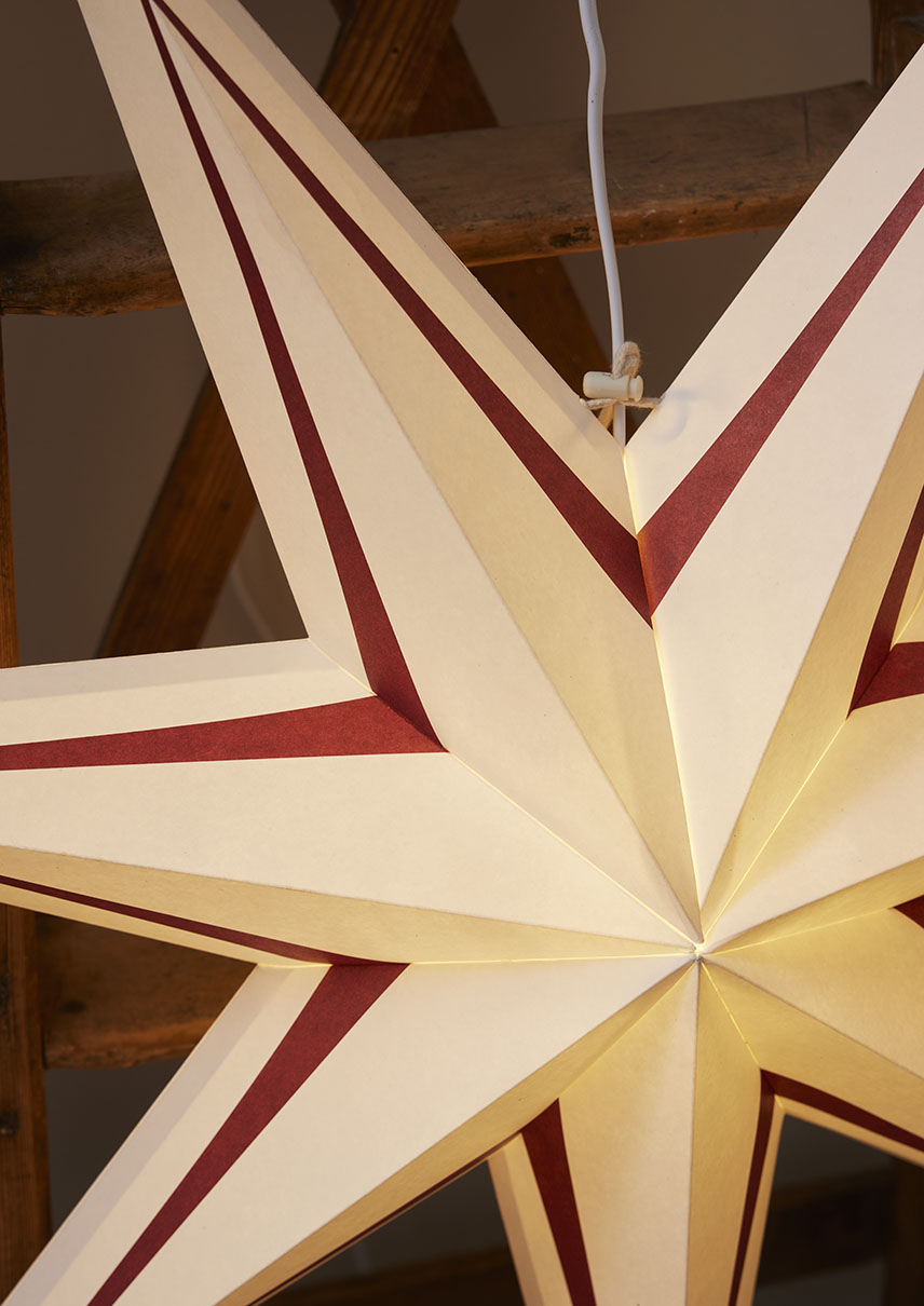 Klassinen valkoinen tähti kauniilla tummanpunaisella raidalla. Ripusta tähti ikkunaan tai seinää vasten tuomaan ihanaa joulutunnelmaa.
