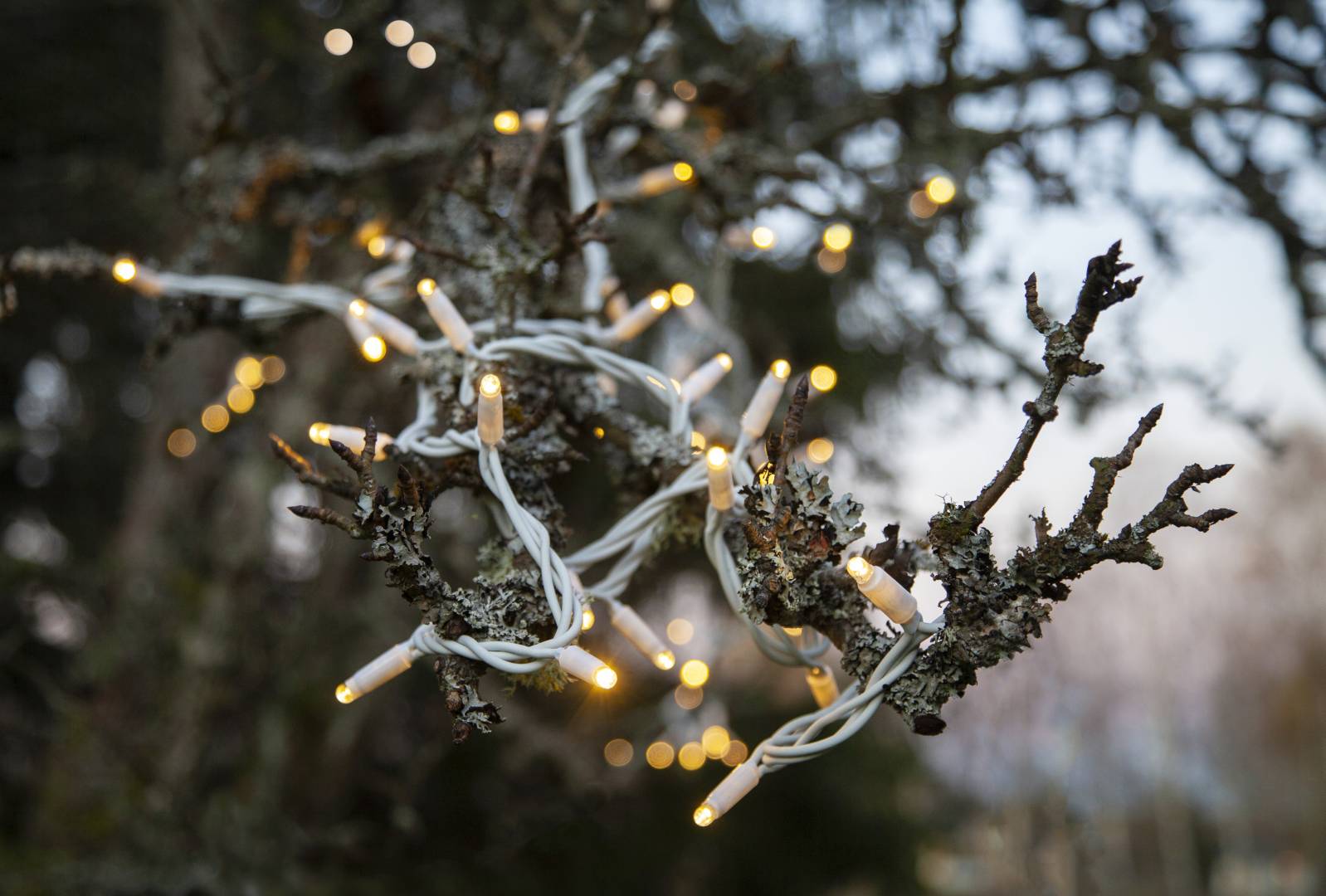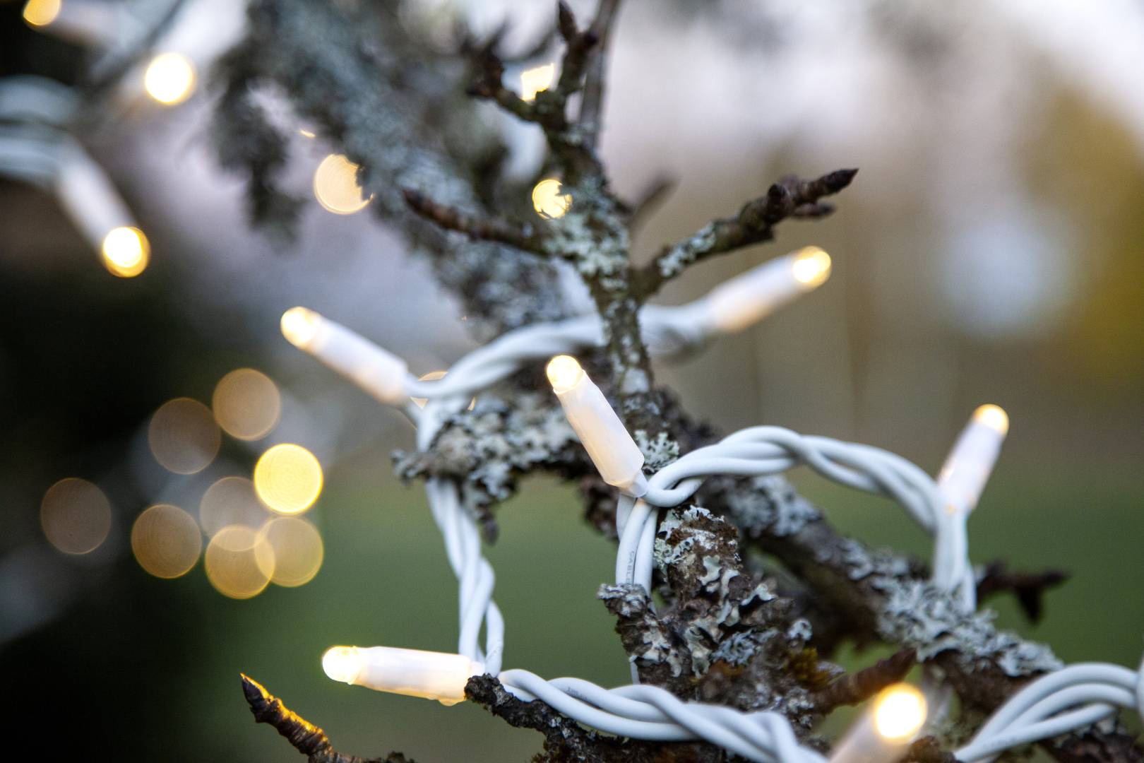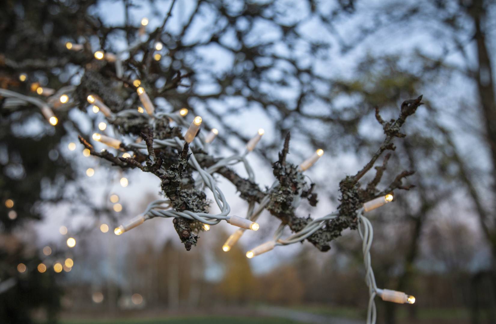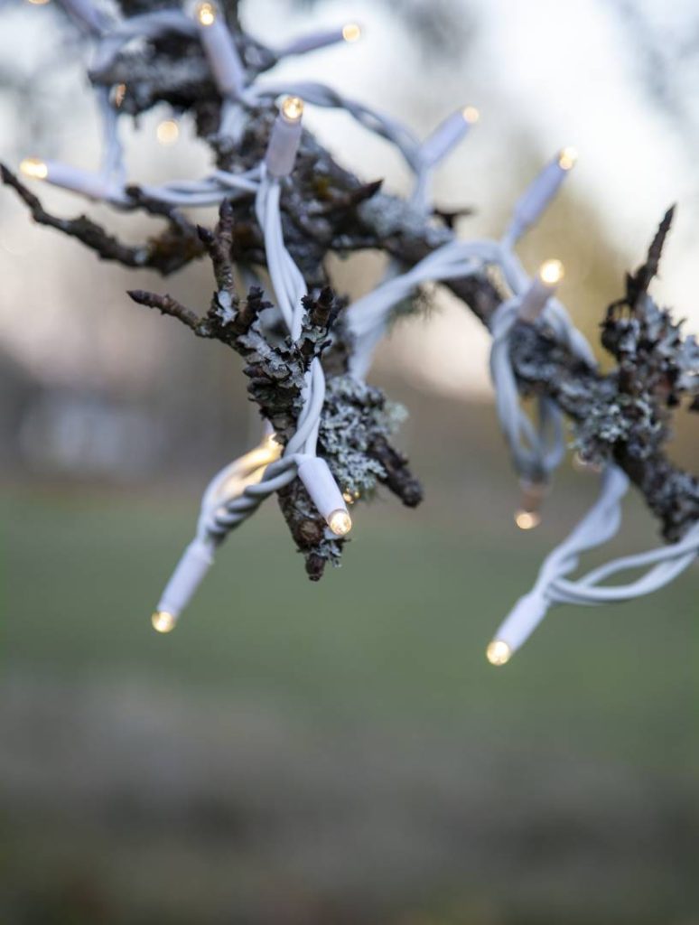 SR-466-06-1 on 5 metriä pitkä valosarja, jossa on valkoisessa kaapelissa 50 lämpimän valkoista LED-lamppua.