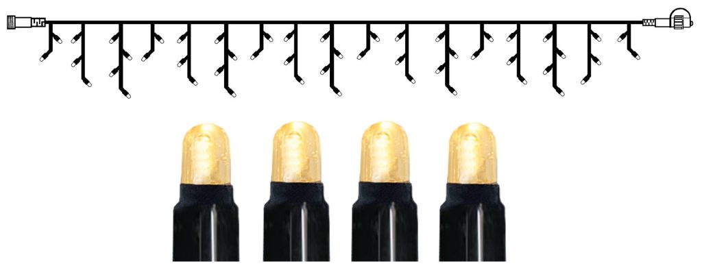 SR-465-46-1 on 3 m leveä ja 40 cm korkea jääpuikkovalosarja, jossa on mustassa kaapelissa 50 lämpimän valkoista LED-lamppua.