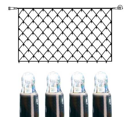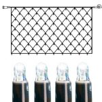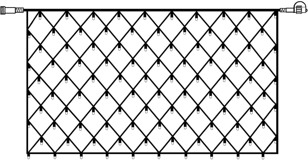 SR-465-18-1 on 2 m leveä ja 1 m korkea valoverkko, jossa on mustassa kaapelissa 100 kylmän valkoista LED-lamppua.