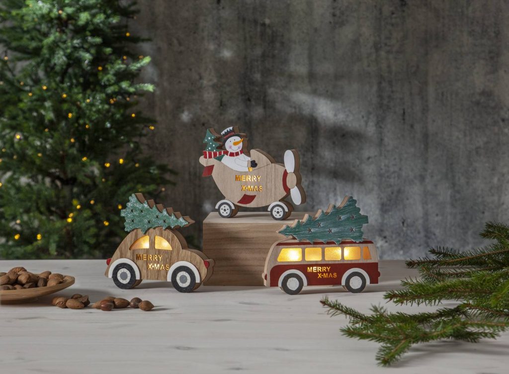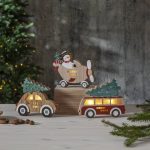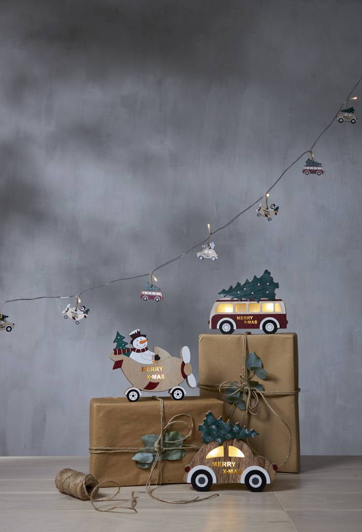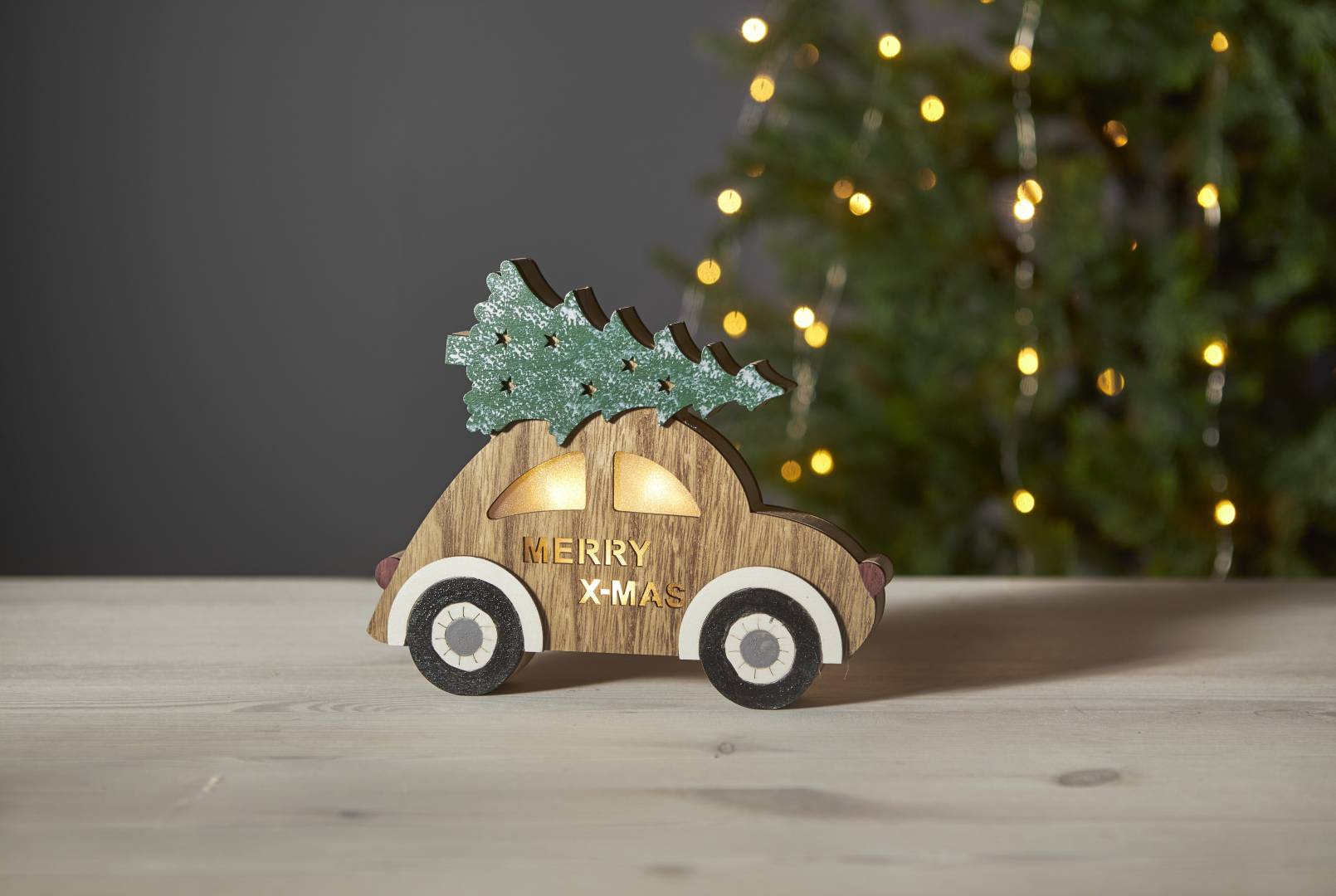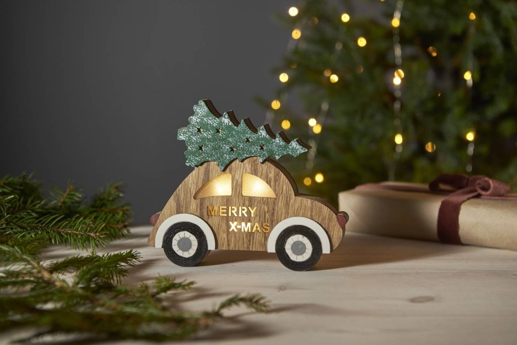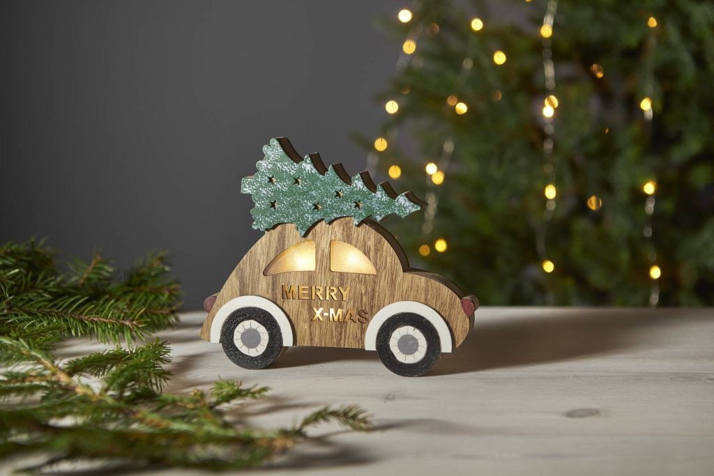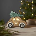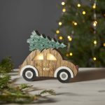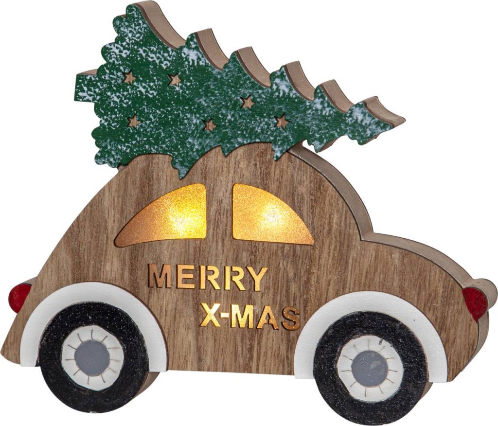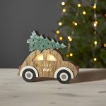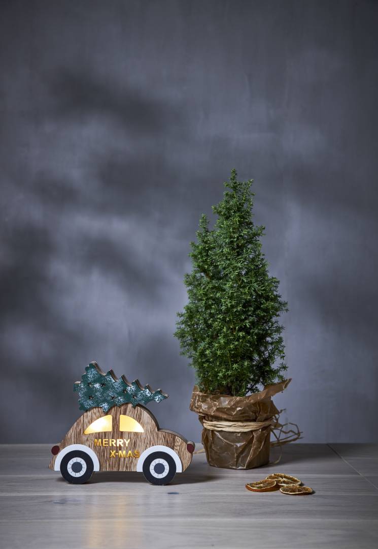 Puinen auto, jonka katolla on joulukuusi. Koristetta valaisee 3 lämpimän valkoista LED-valopistettä. Sopii esimerkiksi ikkunaan luomaan jouluista tunnelmaa.
