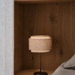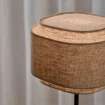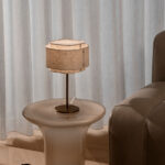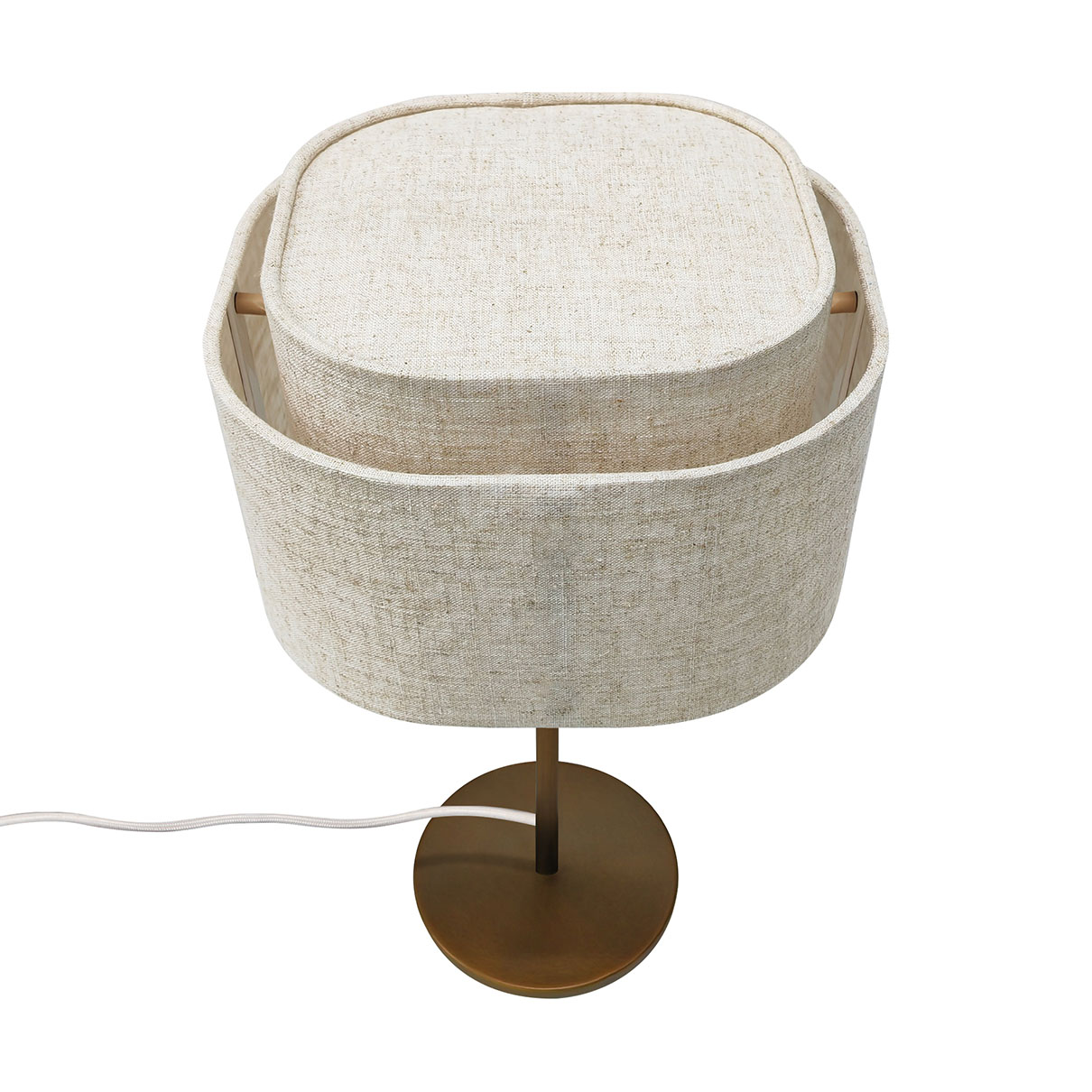 Studio Mavron//Lefèvren suunnittelemassa Takai-pöytävalaisimessa on kauniin muotoinen kangasvarjostin, joka kutsuu katsomaan sitä eri kulmista. Pellavavarjostimen ja kiillotetun messinkijalan yhdistelmä luo pehmeän ja lämpimän muotokielen.