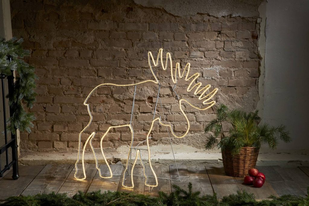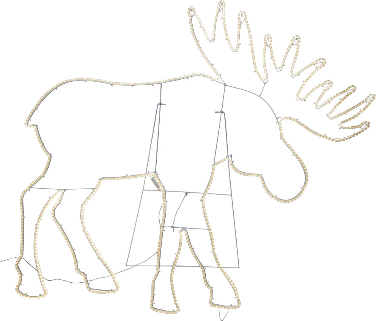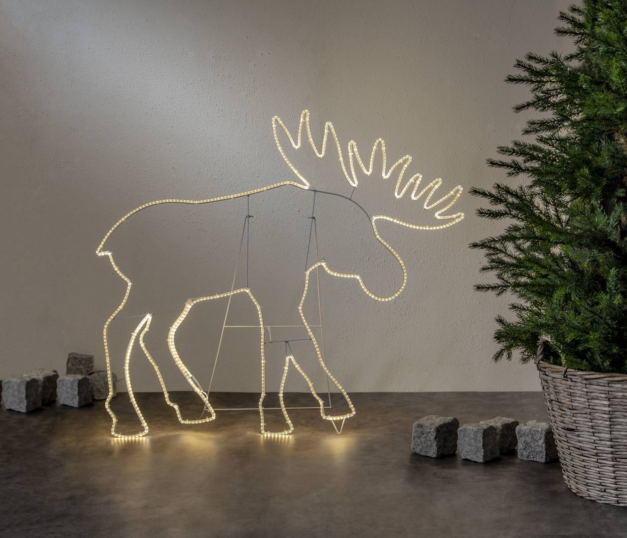 Ulkokäyttöön sopiva hirvi-siluetti, jota valaisee 768 lämpimän valkoista LED-valopistettä. Siluettia voi käyttää joko tuen kanssa tai ripustettuna.