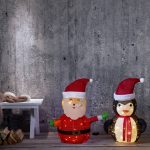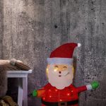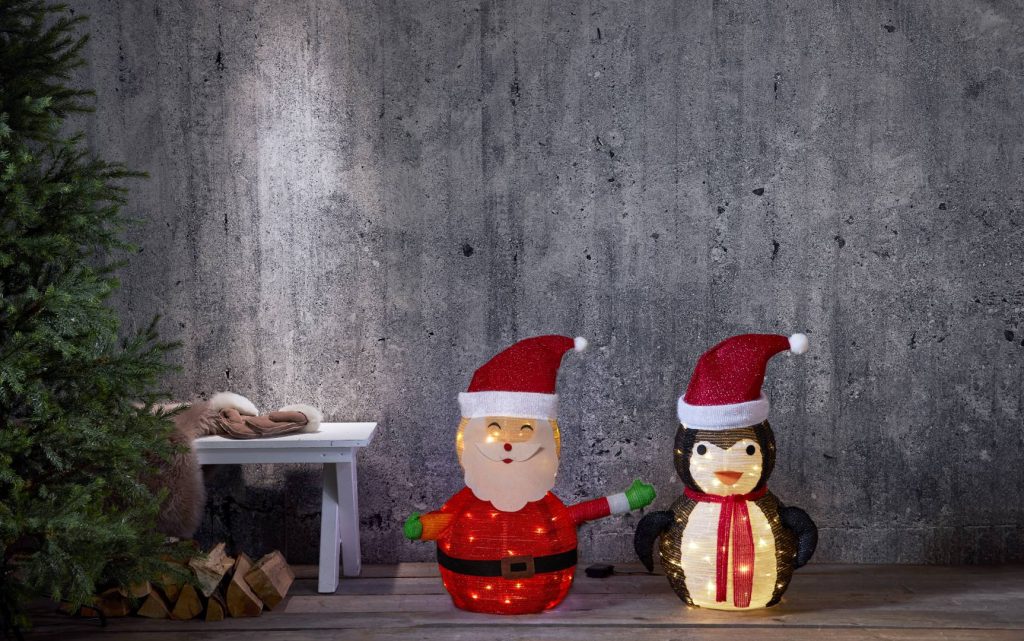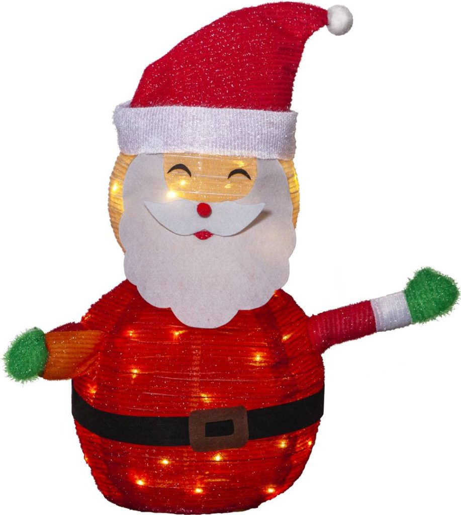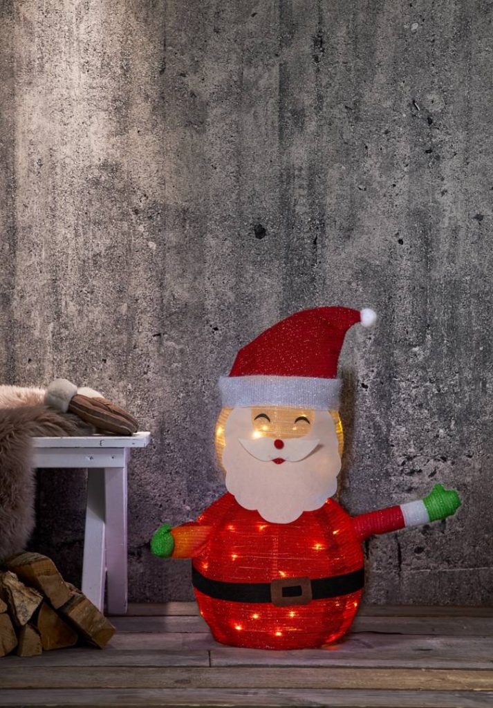 Hauska joulupukkihahmo, joka sopii sekä sisä- että ulkokäyttöön. Aseta koriste ulkona katettuun tilaan, jotta kangas pysyy hyvänä. Koristeessa on 45 pientä valkoista LED-valopistettä.