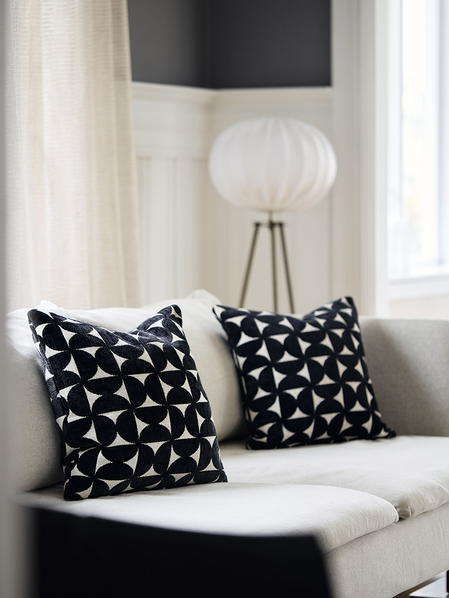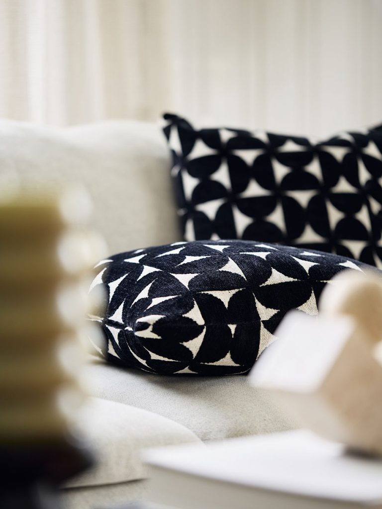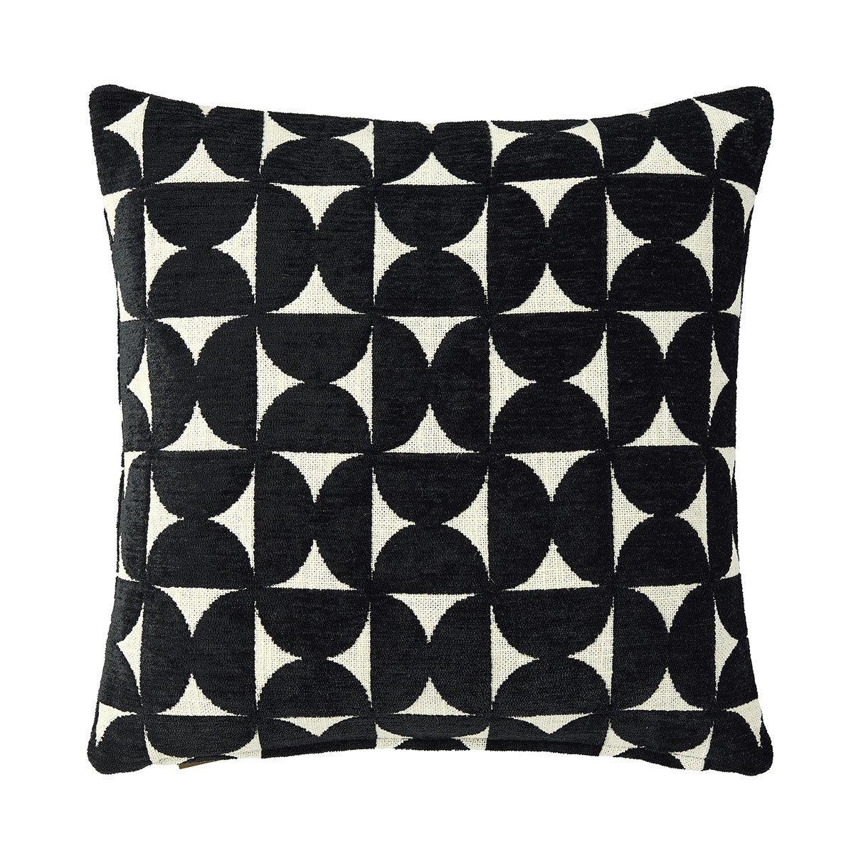 Tyynynpäällinen, jossa on samettinen kohokuvio. Samanlainen etu- ja taustapuolelta. Vetoketju alareunassa.