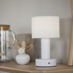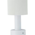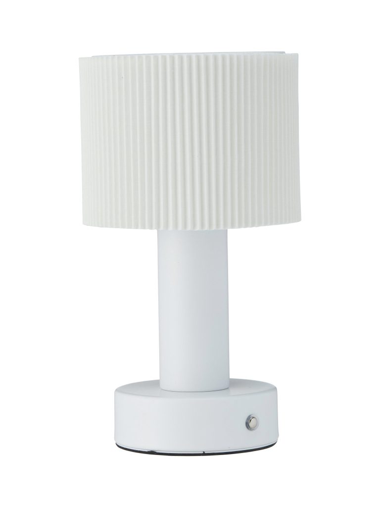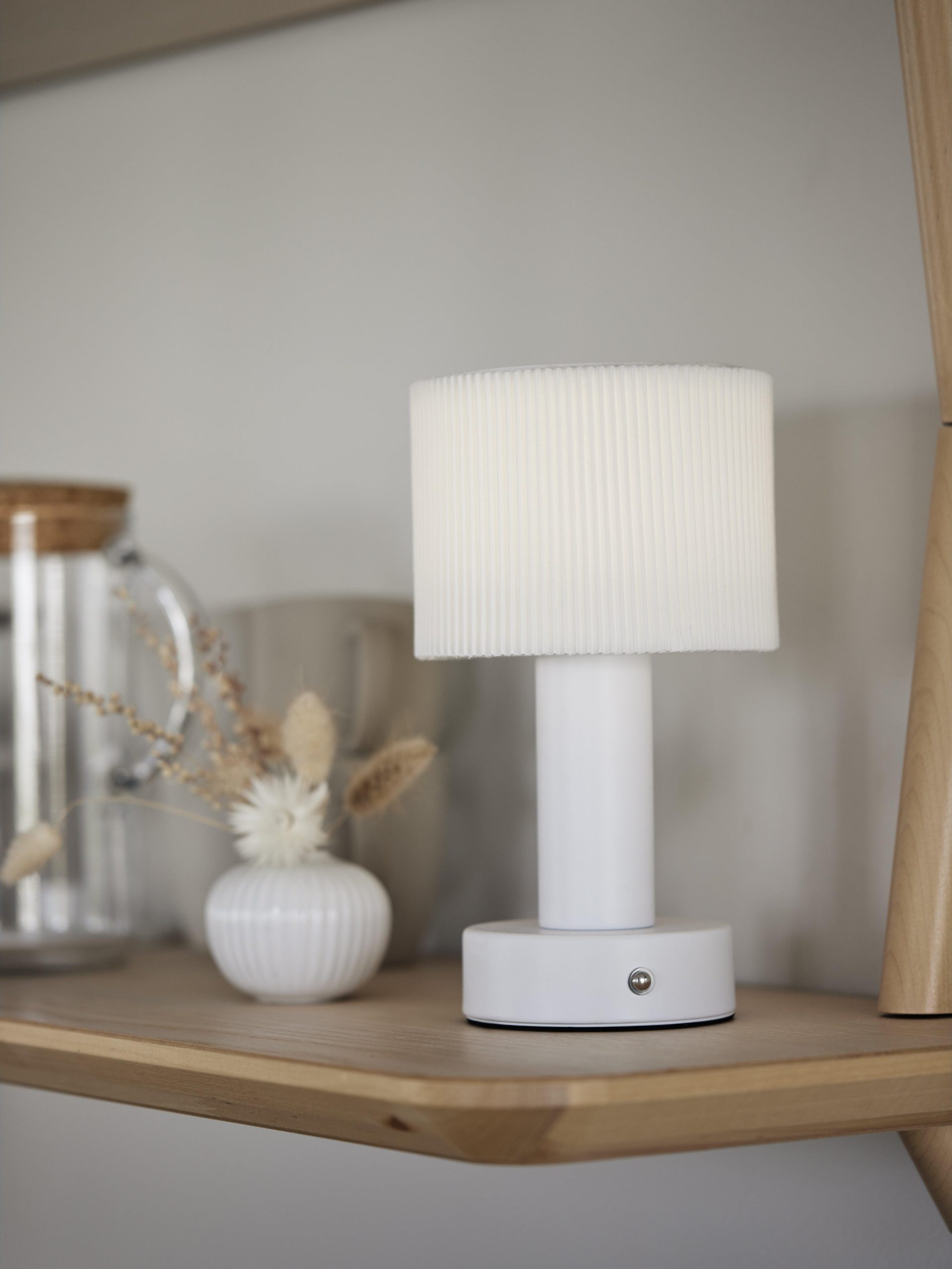Ladattavassa Tiara-pöytävalaisimessa on kolme eri värilämpötilaa: 2700, 4000 ja 6500 Kelviniä. Valaisimen runko on metallia ja varjostin pliseerattua puuvillaa.