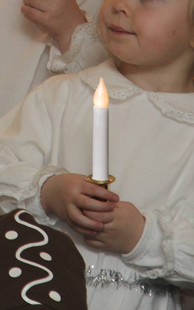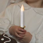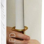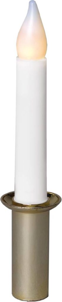 Tiernapojan kynttilä. Kädensija kullanvärinen ja lämmin keltainen liekki.