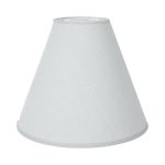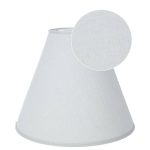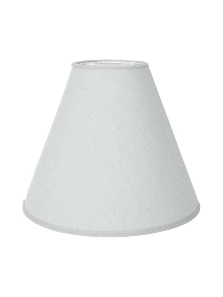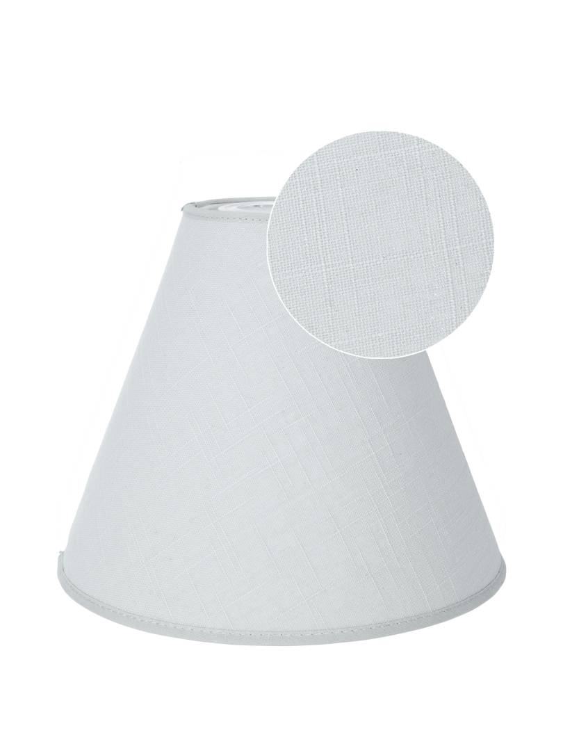 Lampunvarjostin E14-ylälaippakiinnityksellä, puuvillakangasta. Kankaassa on elävä, pellavakankaan rakennetta muistuttava pinta. Valkoinen sisäpinta ja reunusnauha.