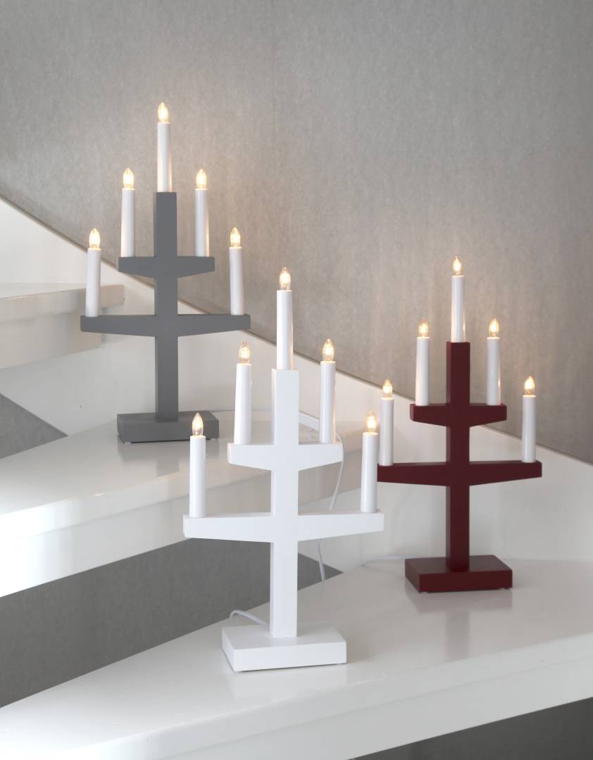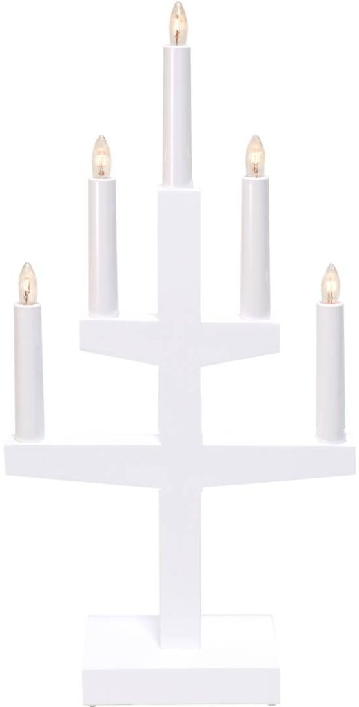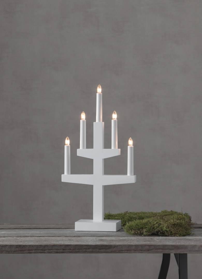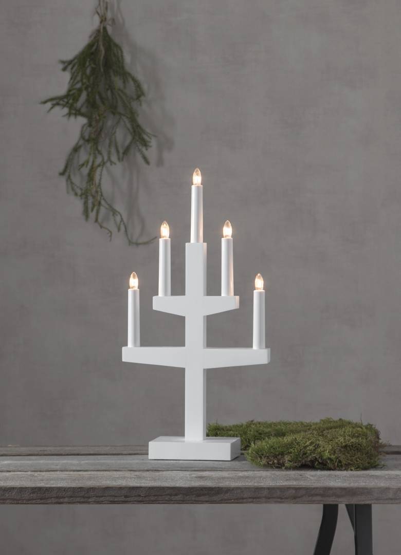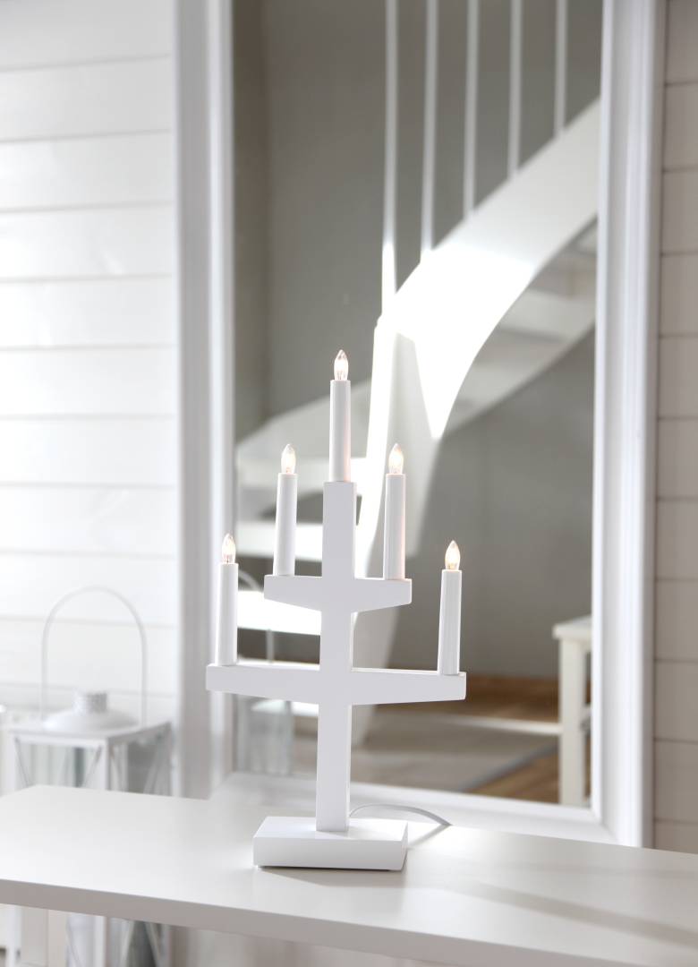Tyylikäs valkoiseksi maalattu puukynttelikkö, joka sopii esimerkiksi ikkunalaudalle tuomaan ihanaa joulutunnelmaa.