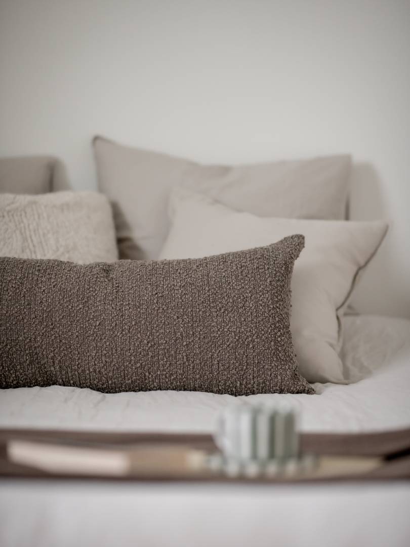 Tyynynpäällinen buklee-kangasta. Vetoketju alareunassa.