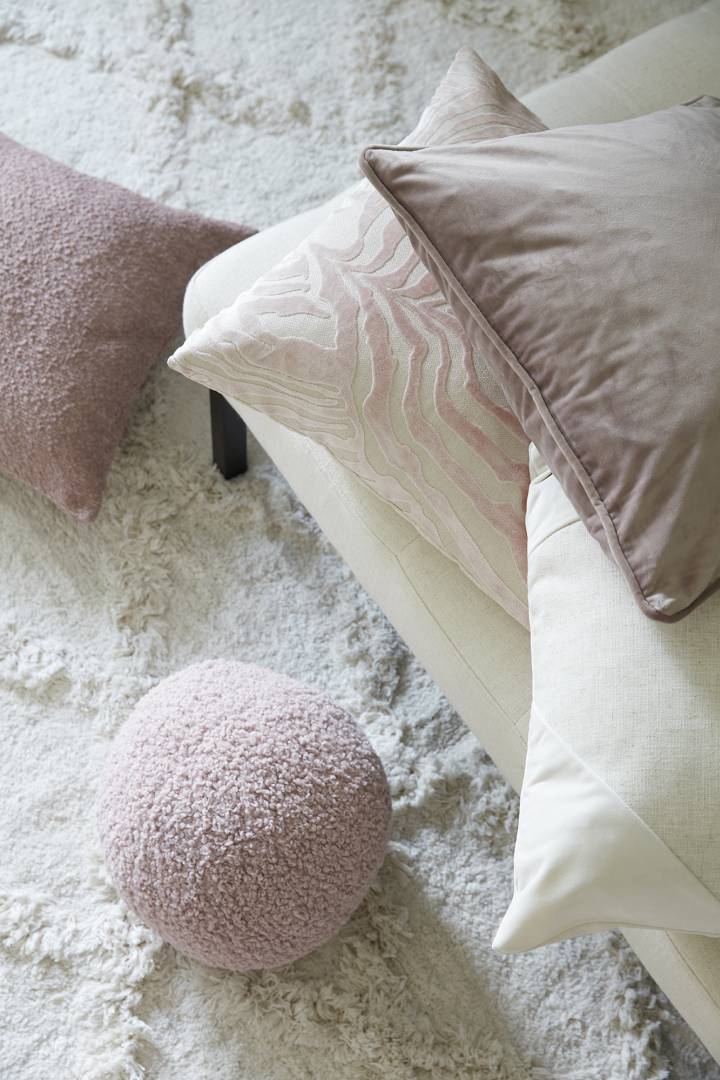 Tyynynpäällinen buklee-kangasta. Vetoketju alareunassa.