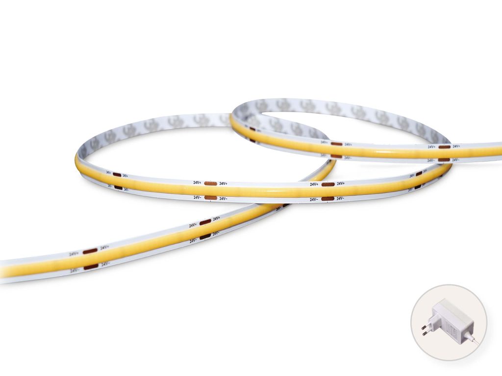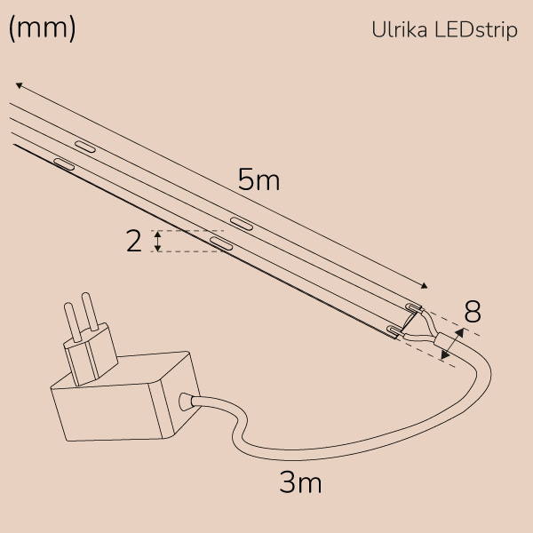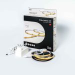 Pakkaus sisältää plug-in -muuntajan 3 metrin johdolla, jossa on katkaisija. LED-nauhan pituus on 5 metriä, ja se on leikattavissa merkityistä kohdista.