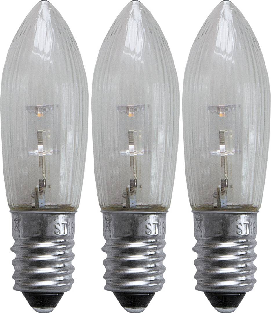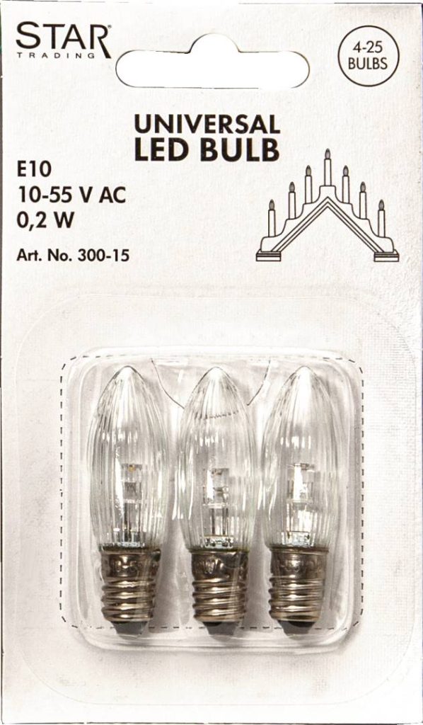 LED-varalamppu Starin 4-25 -haaraisiin kynttelikköihin, joissa on tavallinen seinäpistoke. Pakkaus sisältää 3 lamppua, joissa on kirkas lasi.