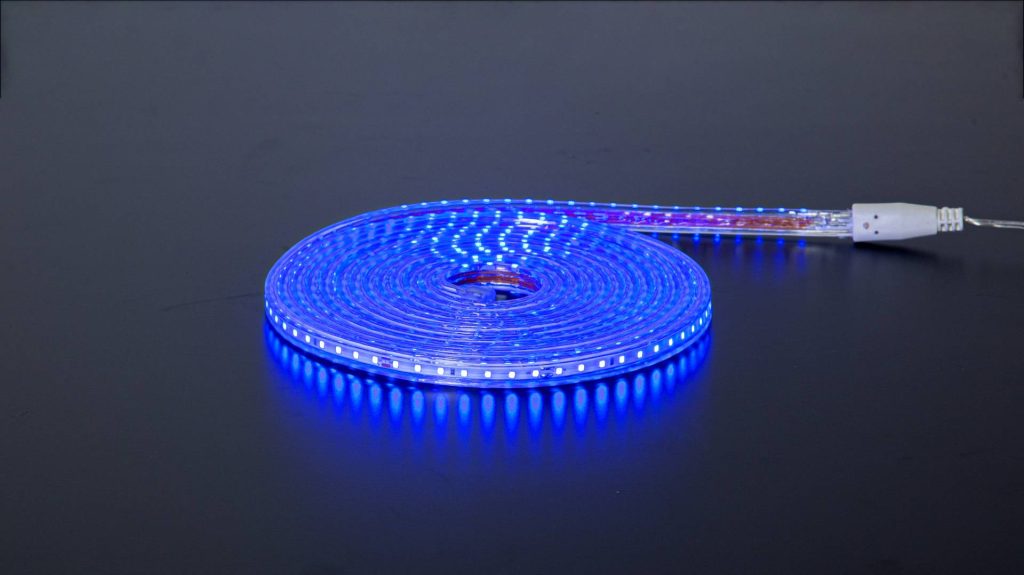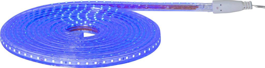 5 metriä pitkä litteä valoletku ulkokäyttöön 480 sinisellä LED-valolla. Miellyttävä valo.