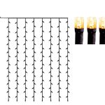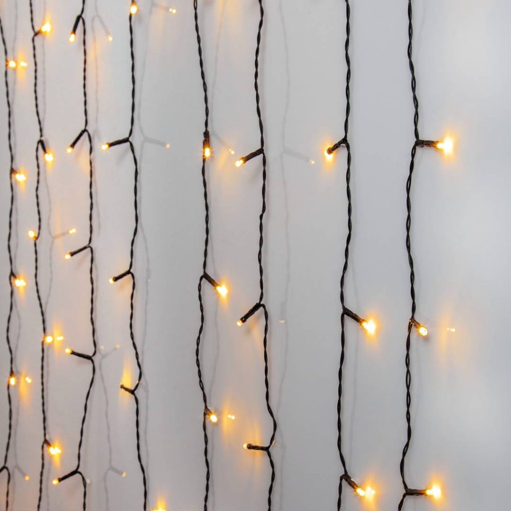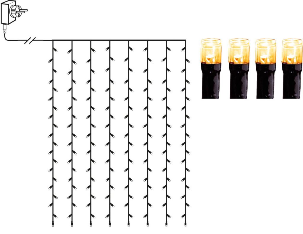 Ulkokäyttöön sopiva valoverho, jossa on mustassa kaapelissa 120 lämpimän valkoista, kultaan vivahtavaa LED-valoa.
