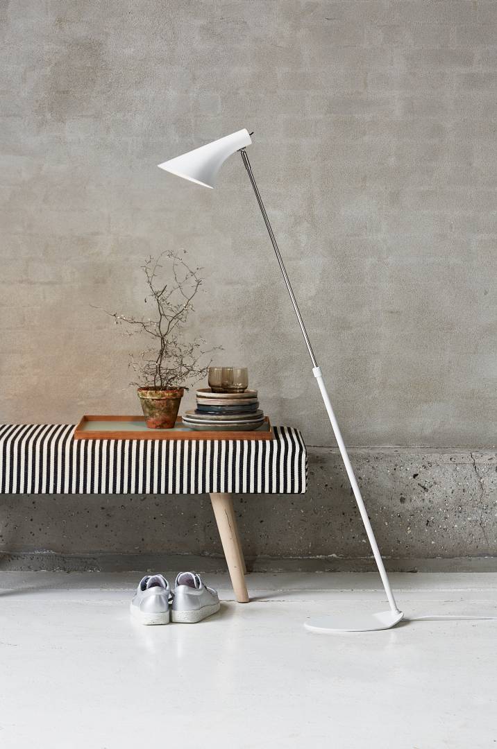 Klassinen, ajaton ja moderni lattiavalaisin valkoista ja kromin väristä metallia.